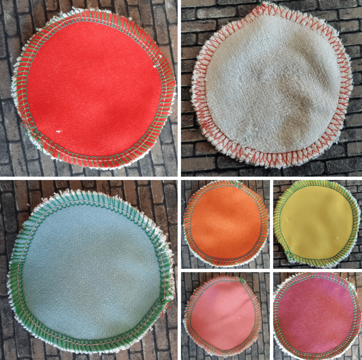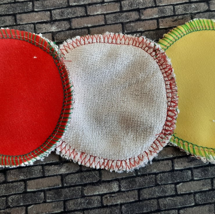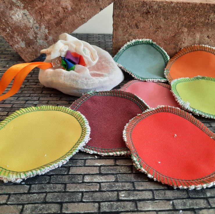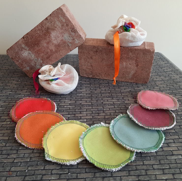 Upcycled reusable make up pads. You can use these make up pads wash then reuse over and over again. Each pad has a rainbow colour on one side and upcycled toweling on the other. The coloured fabric has been upcycled from fabric samples and are beautiful and soft