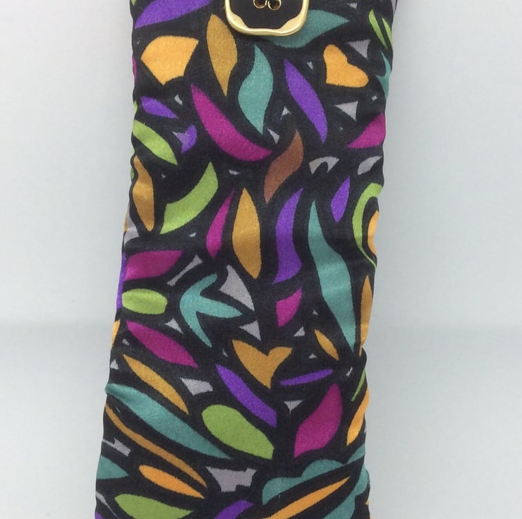 This glasses case is made from a multicoloured silky fabric with an abstract design on a black background. It measures approximately 17.5cm x 7.5cm is lightly padded and lined with turquoise felt.. It has a vintage, black and gold square button and black elastic loop closure.