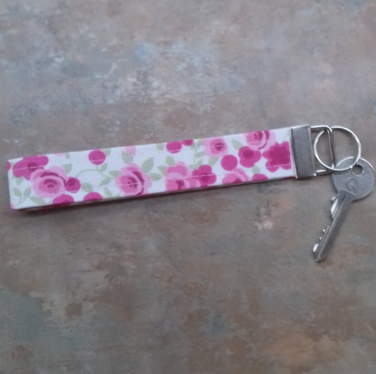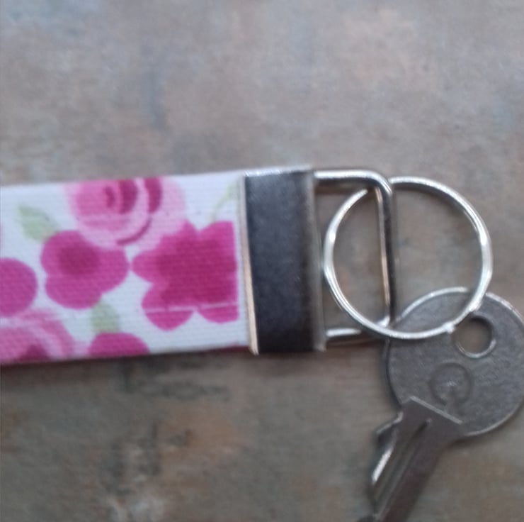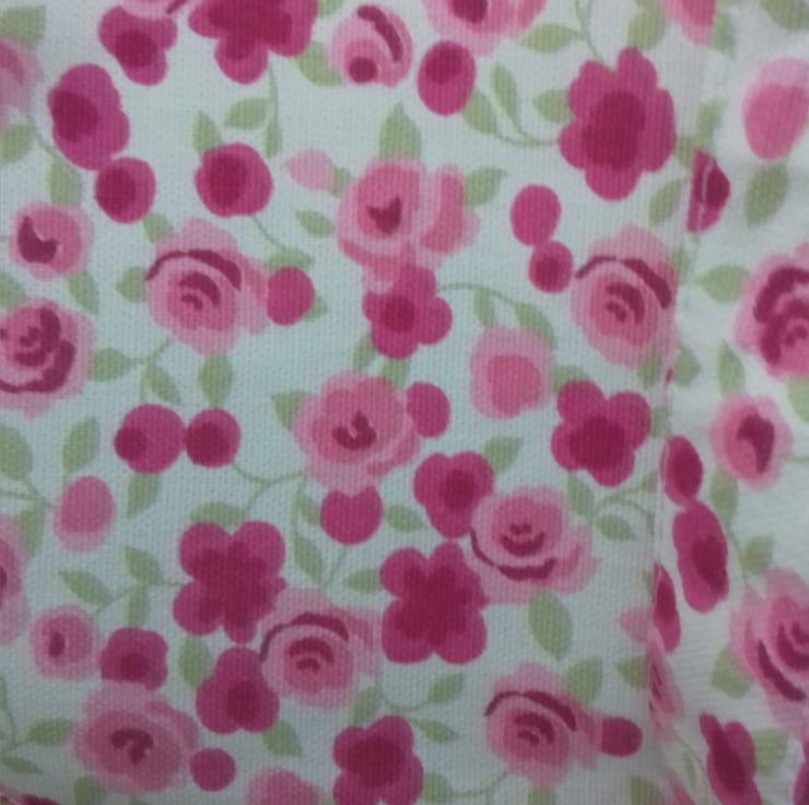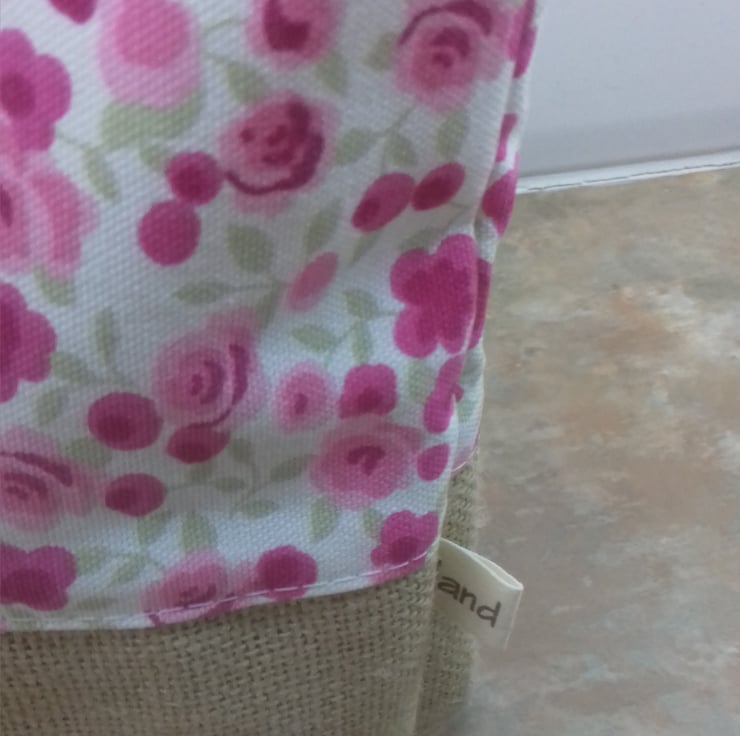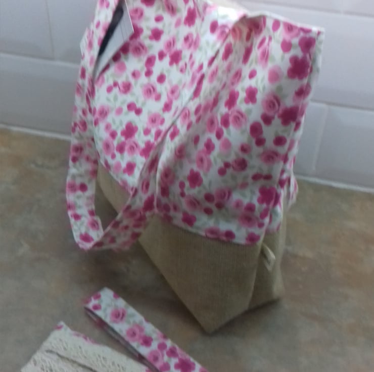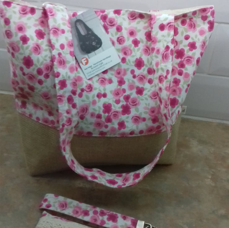 This tote bag with matching accessories comes with a wristband key ring and matching tissue holder all in the same floral rose pink fabric.the bag has a Hessian box base .the set has a shabby chic look.