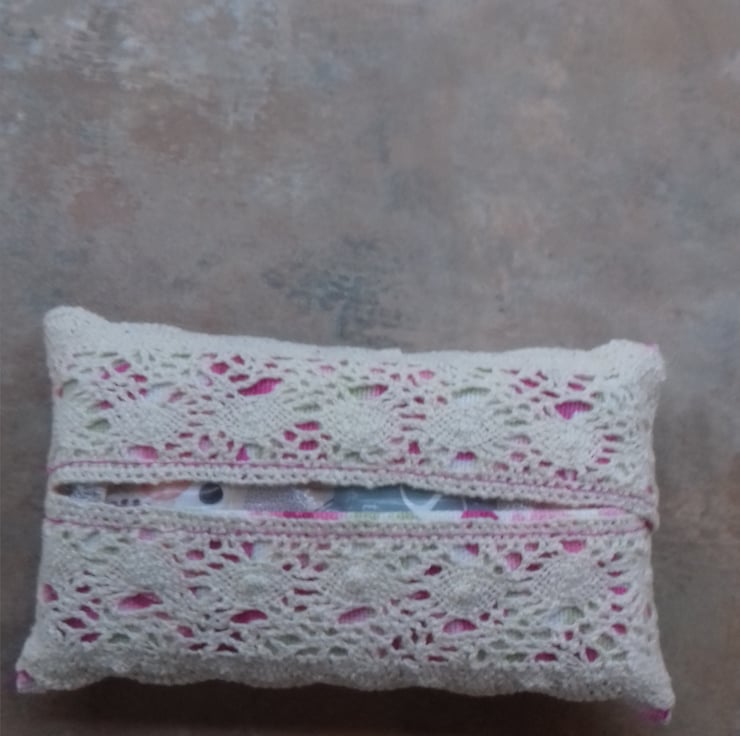 The tissue holder is in the pink rose fabric with vintage lace to add to the shabby chic look.