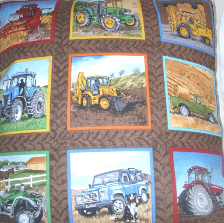 ON the Farm Farm vehicles cushion with tractors in fields, a combine harvester, a land rover and collie dog, a buggy by fence with a horse in the paddock, a digger and a fork lift truck moving bales of hay in squares on a dark brown background, embroidered onto a cream backing.
