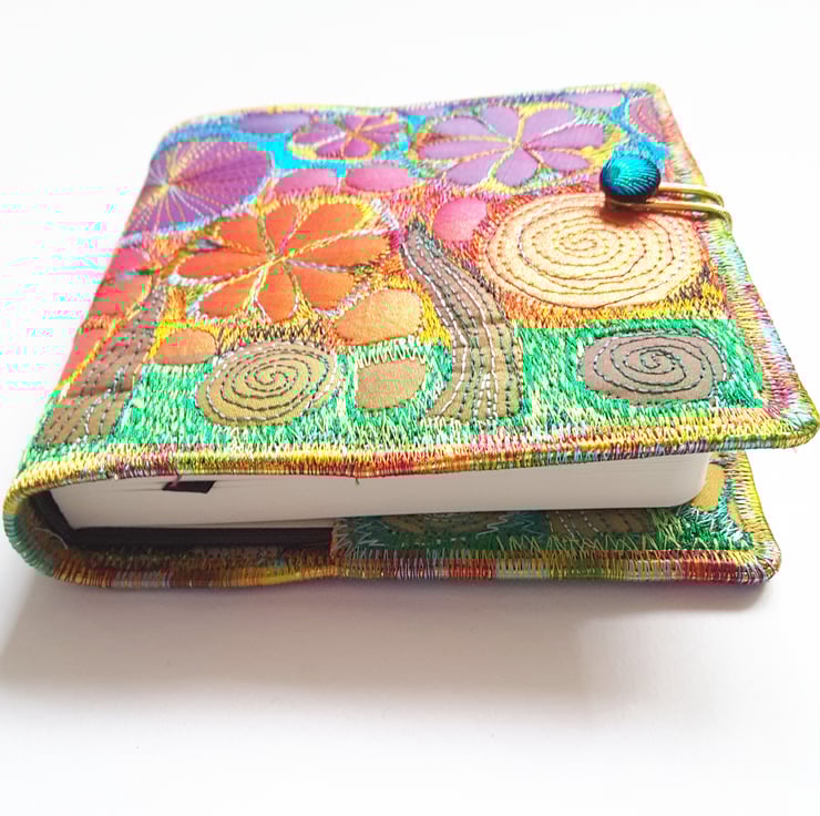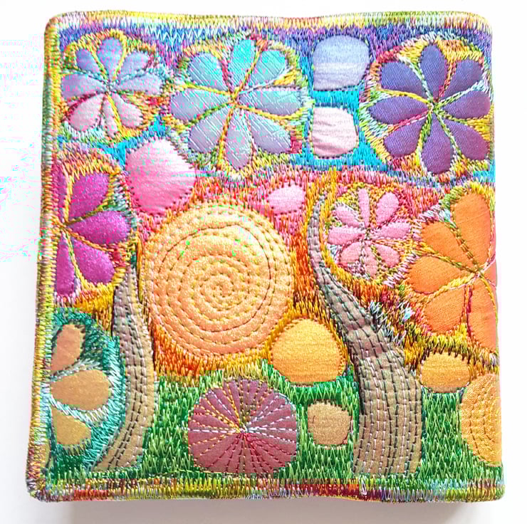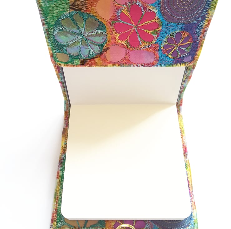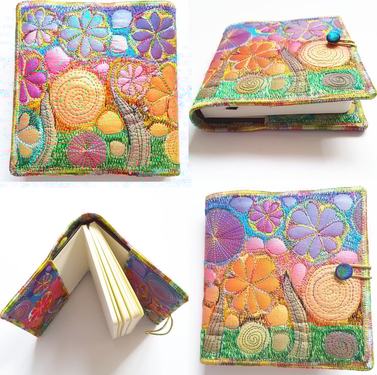 This is a handmade machine stitched fabric textile notebook cover and cream plain paper artists sketchbook 12cms x 12cms. 80 sheets 140gsm acid free. The cover is removeable and you can replace the sketchbook inside.