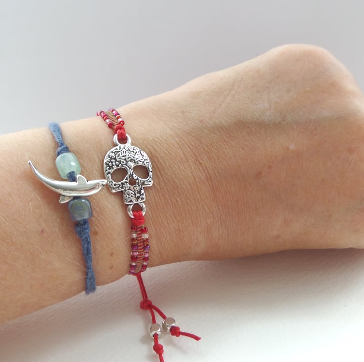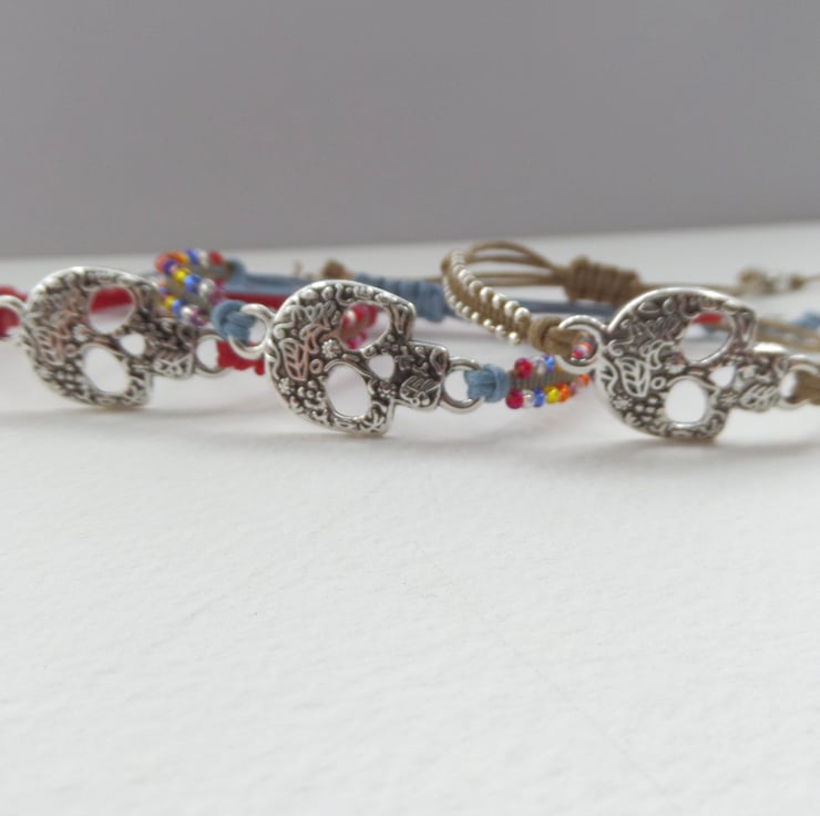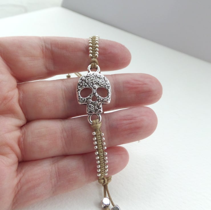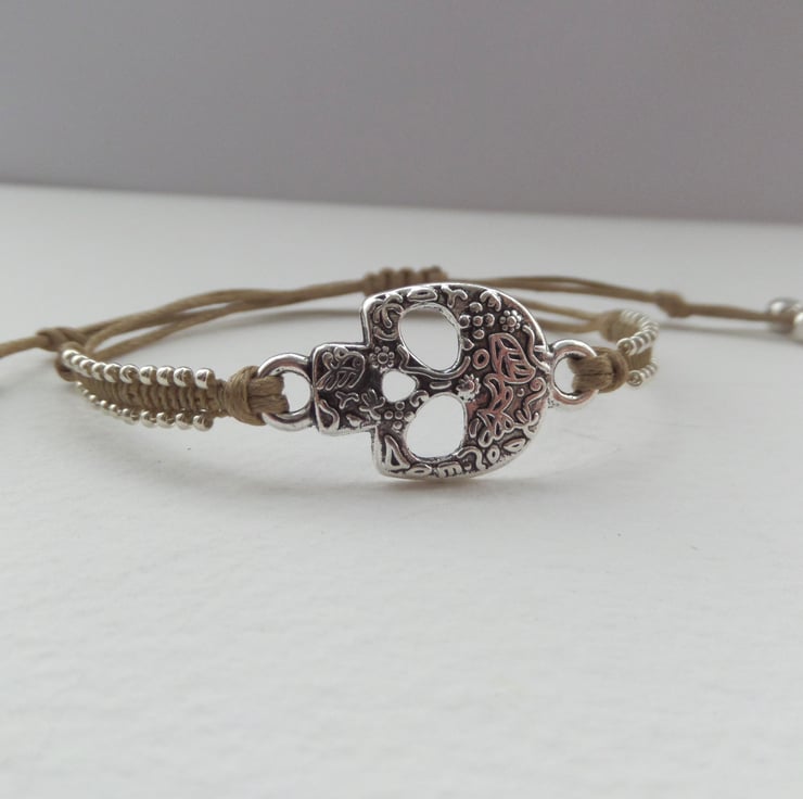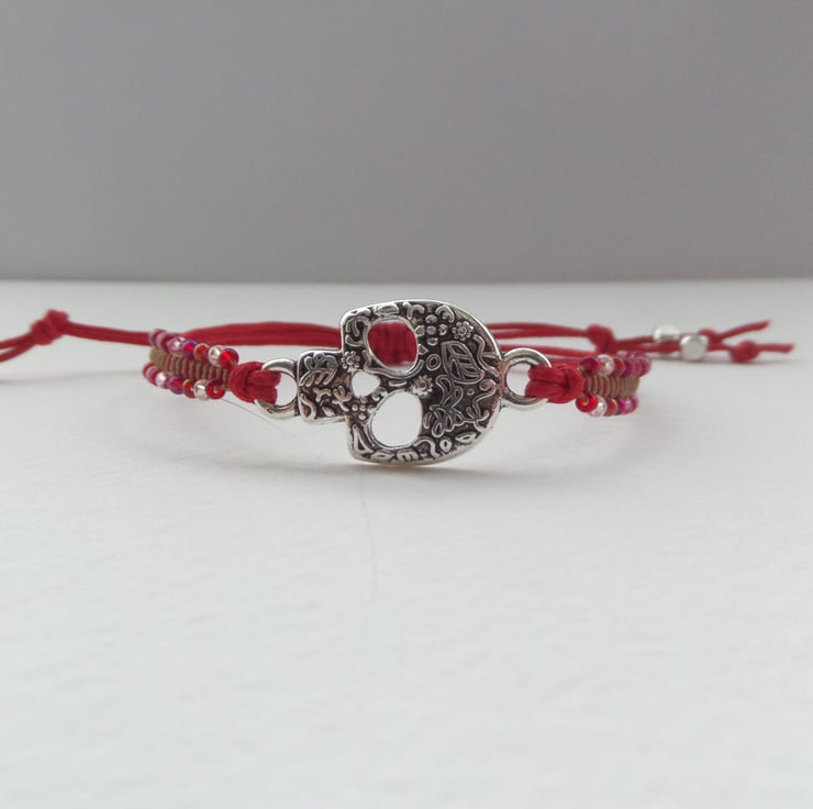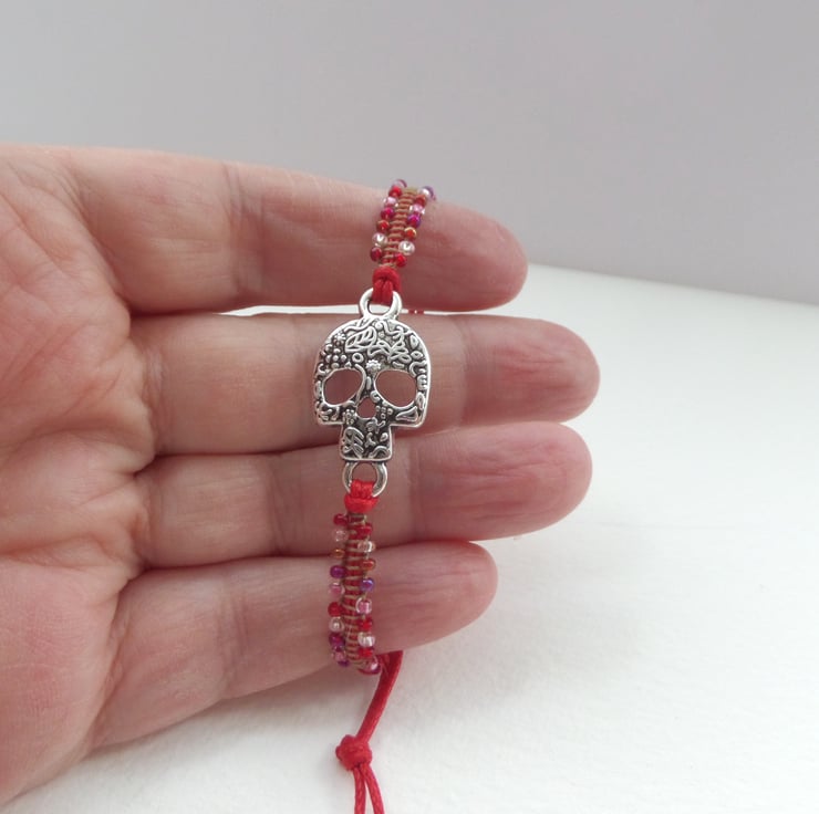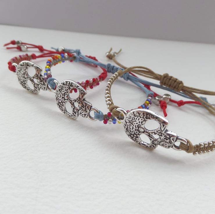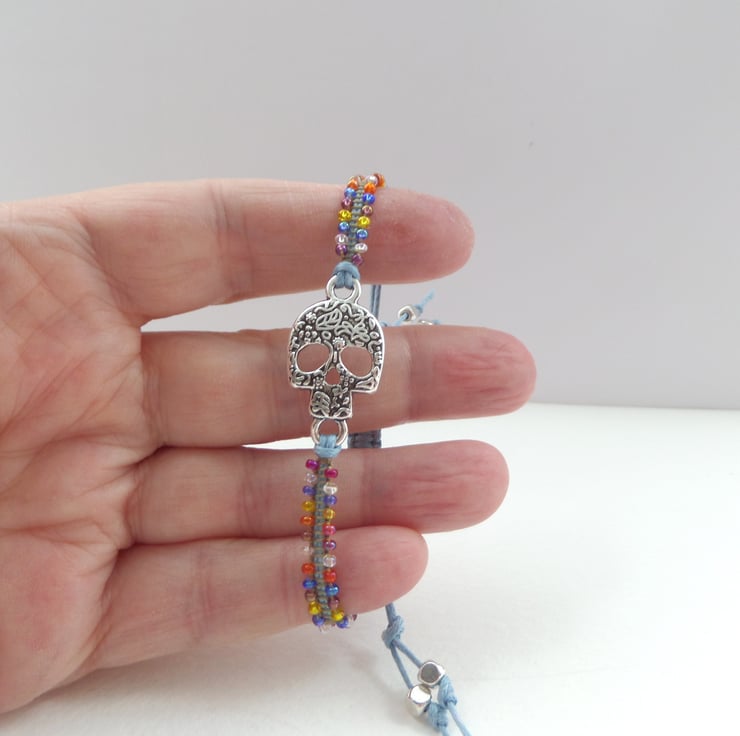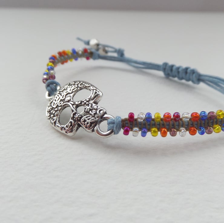 Day of the dead mexican skull focal on this one of a kind beaded macramé bracelet.