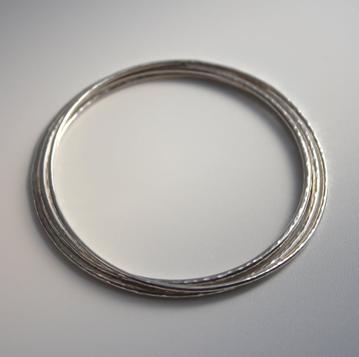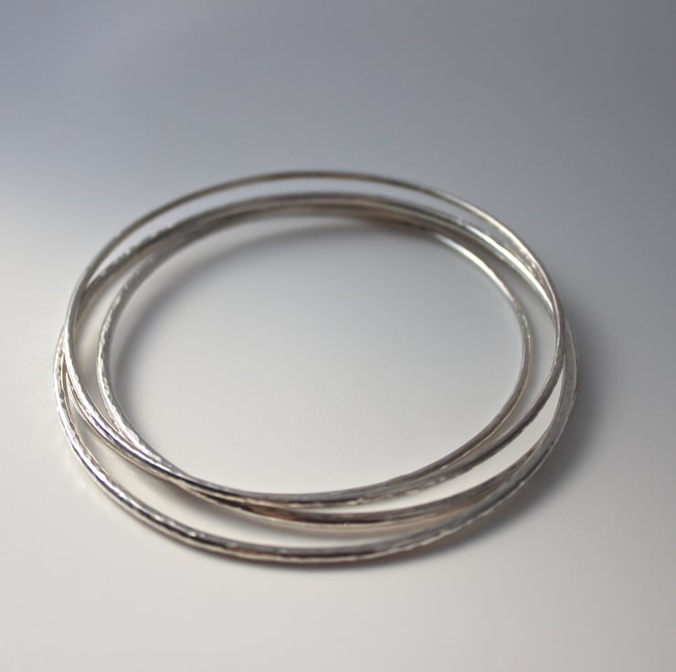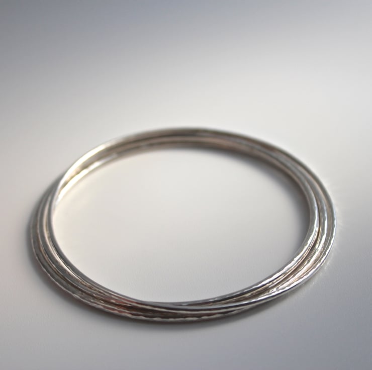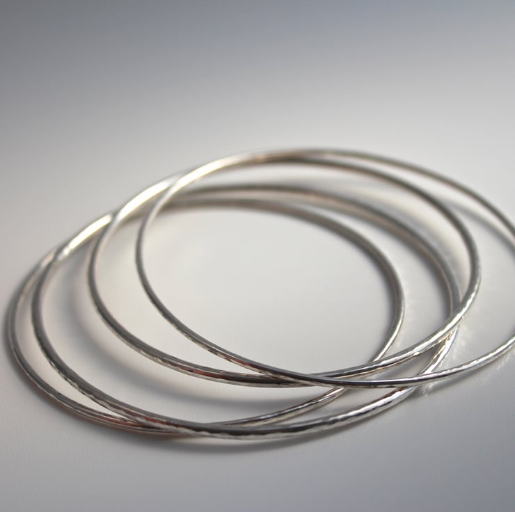 Handmade from sterling silver 1.5mm round wire, these bangles have been lightly hammered to catch the light and hand polished to a high shine. Simple and stylish, these bangles look lovely on their own, but can also look great when 2, 3 or more are stacked together - the choice is yours....