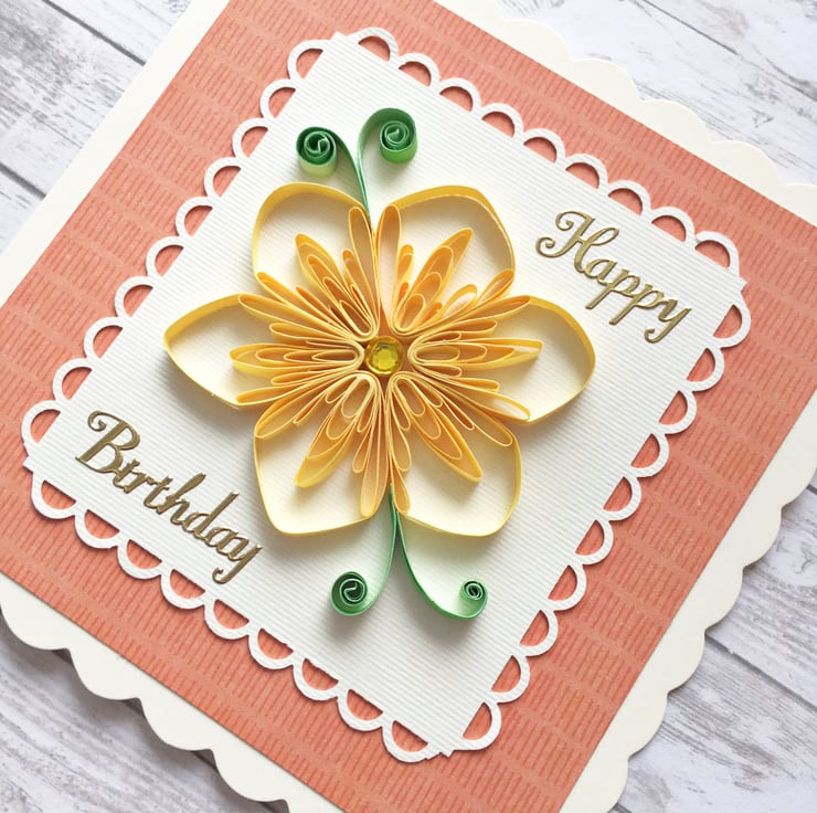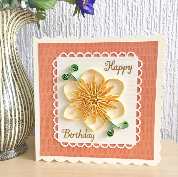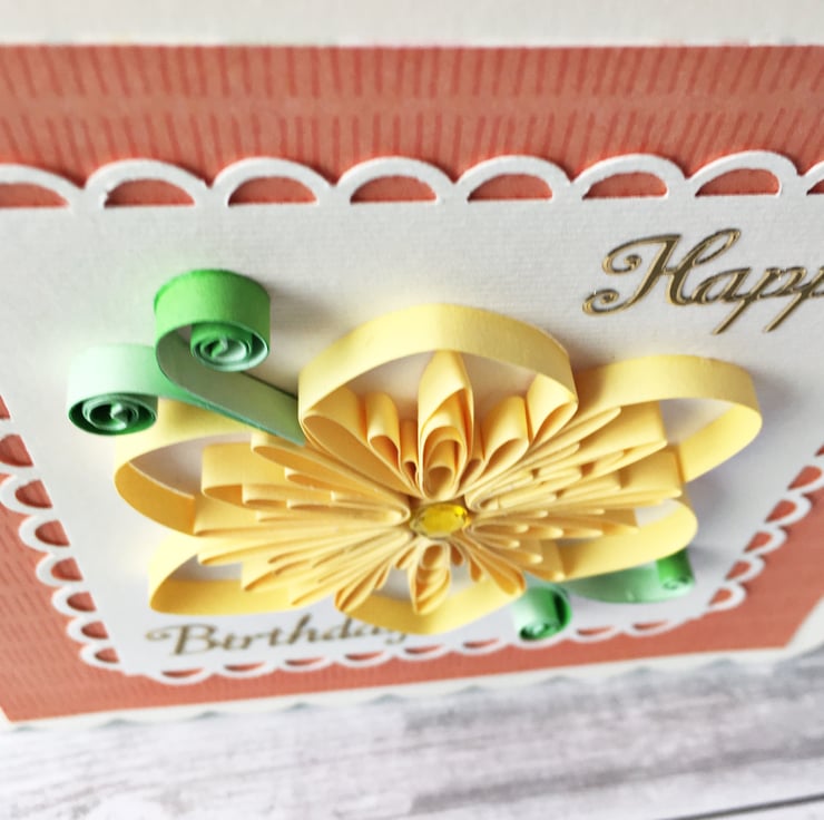 This card features a large quilled yellow flower with an embellished centre and two-tone green paper swirls. The scalloped ivory mat sits on orange lightly patterned background and the card says Happy Birthday in gold foil letters. Inside the card is blank for your own greeting.