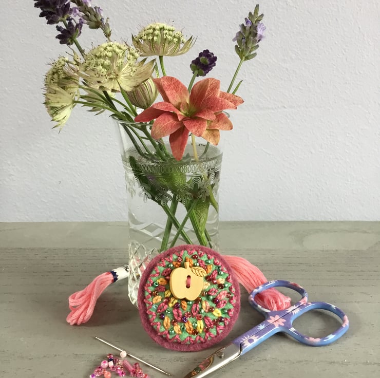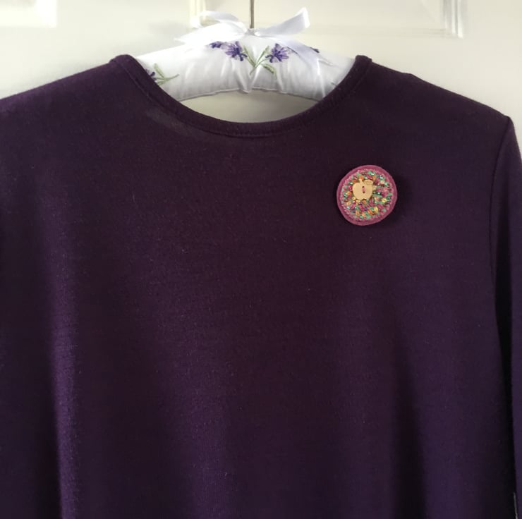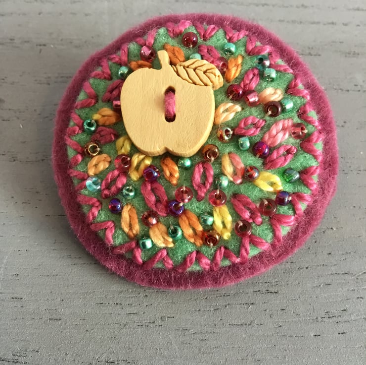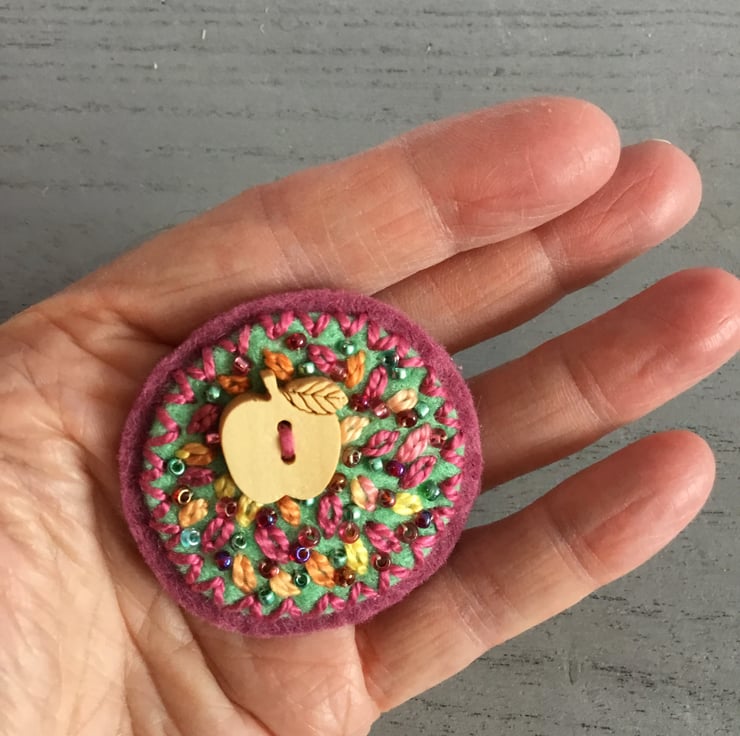 This Hand Embroidered Apple Brooch has a little wooden apple shaped button stitched onto circles of pastel green and dark pink felt. It is surrounded by hand embroidered Lazy-Daisy Stitches and seed beads in a colourful array of pinks, yellows, green and dark red......it looks as though the sweet apple has fallen down in the orchard and is resting on leaves of many colours......