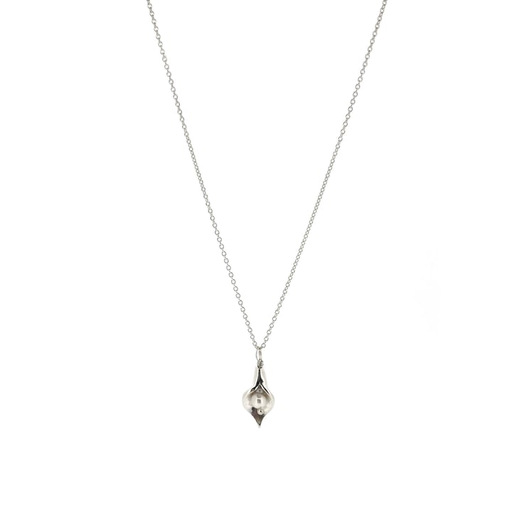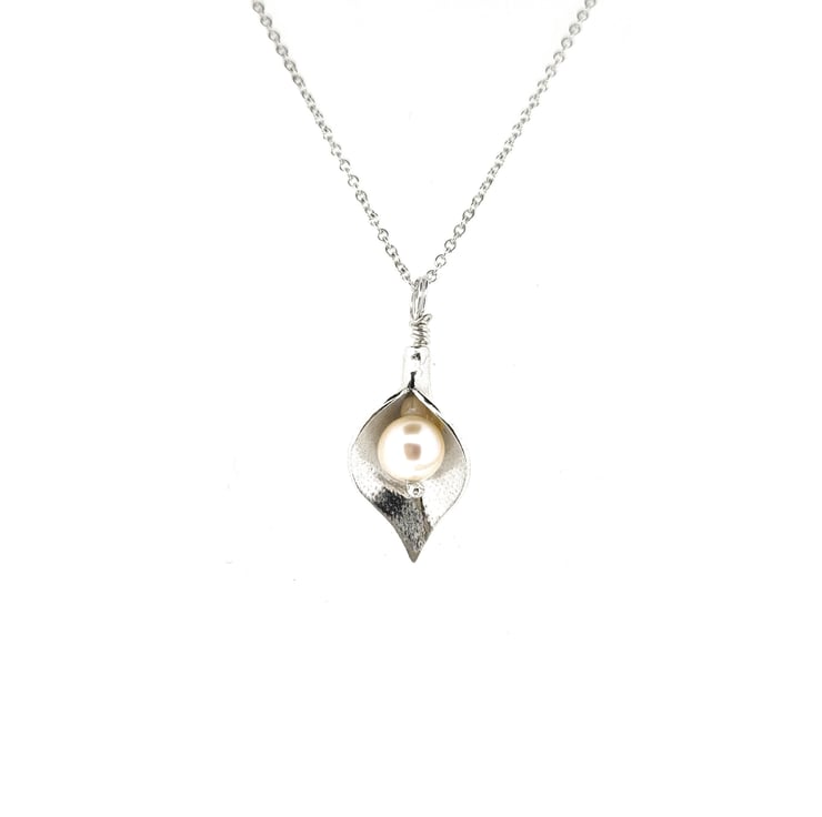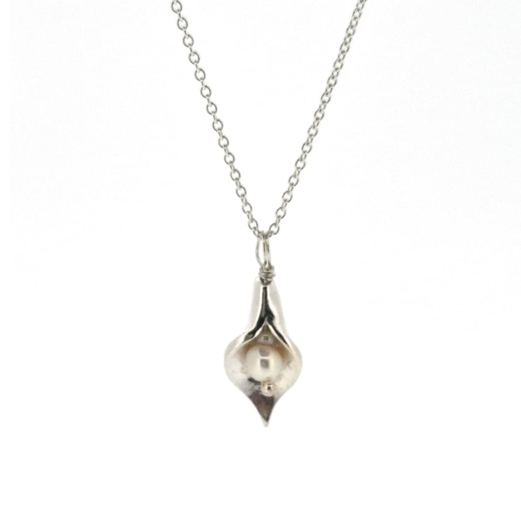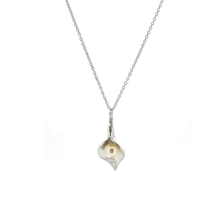 A beautiful arum lily that dances with your movement. This pendant is crafted in solid silver. Nestled inside the lily sits a freshwater pearl.