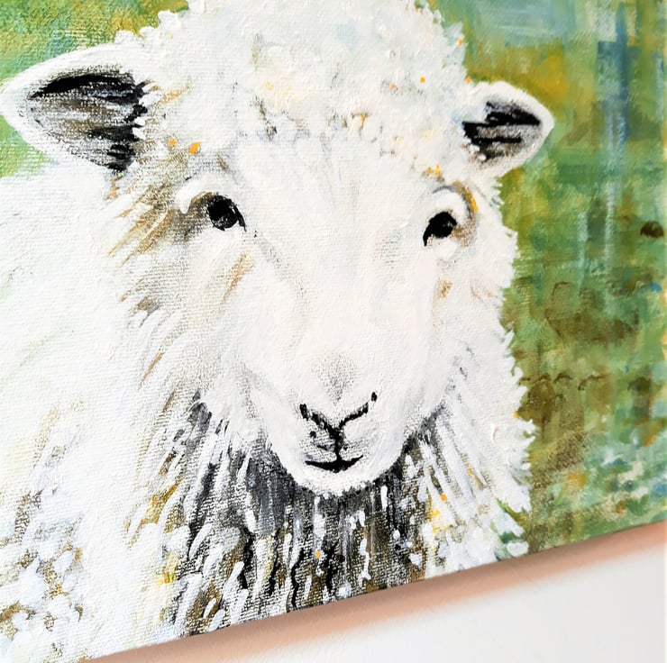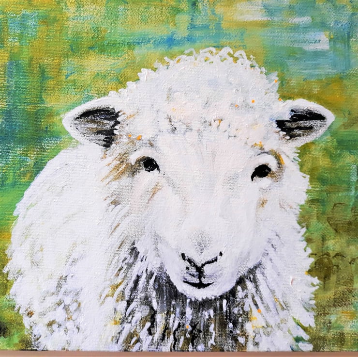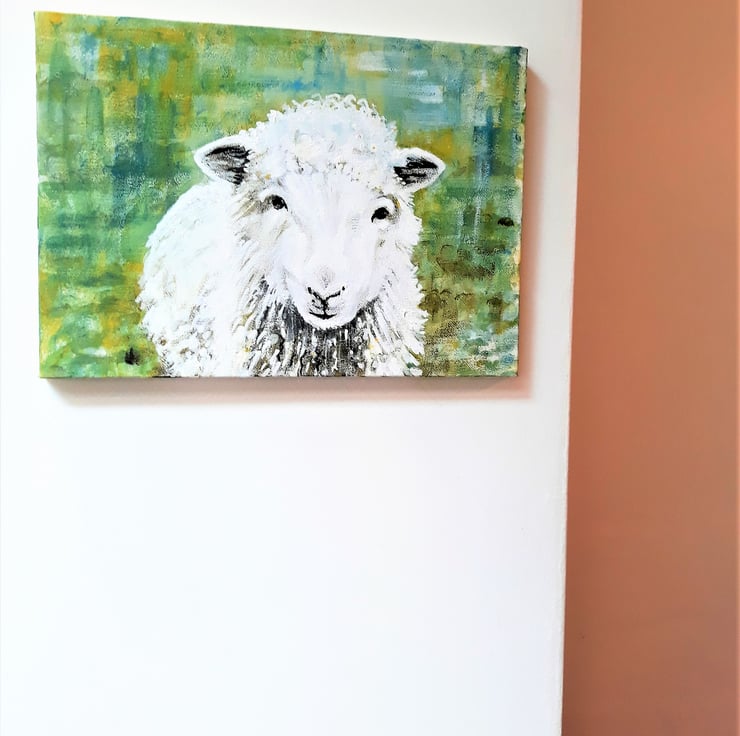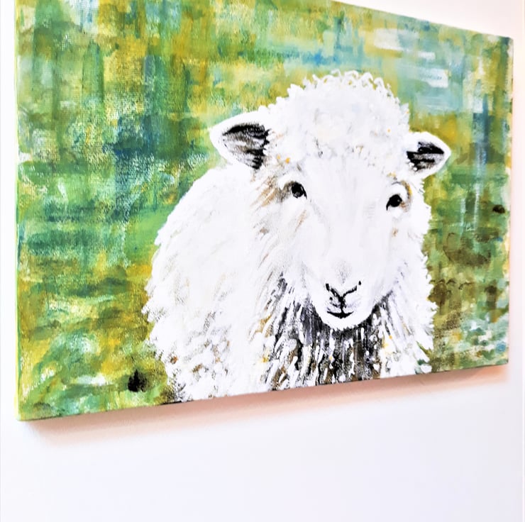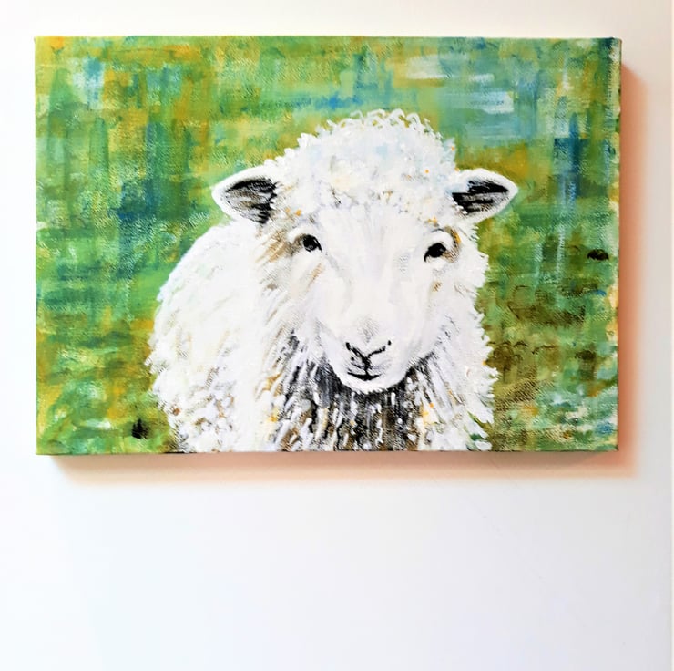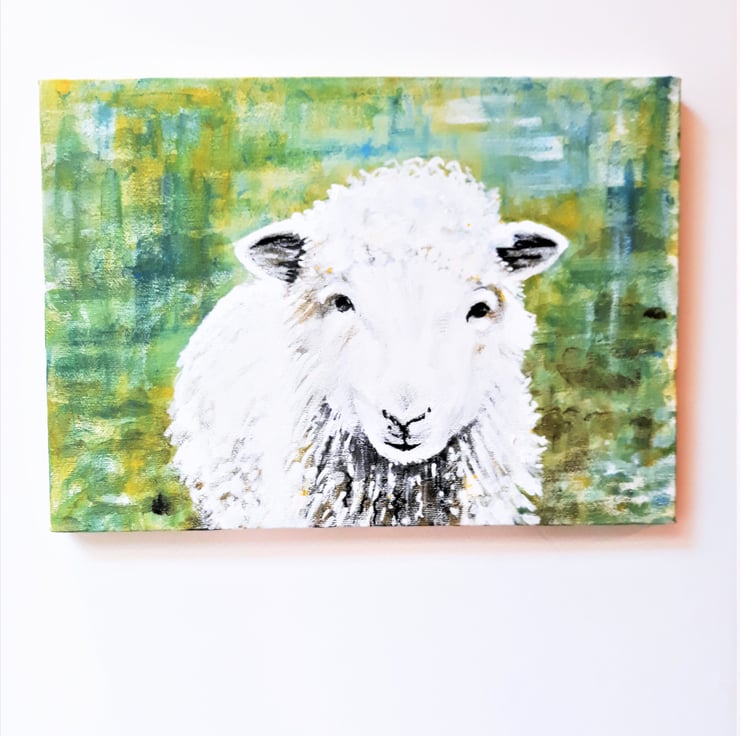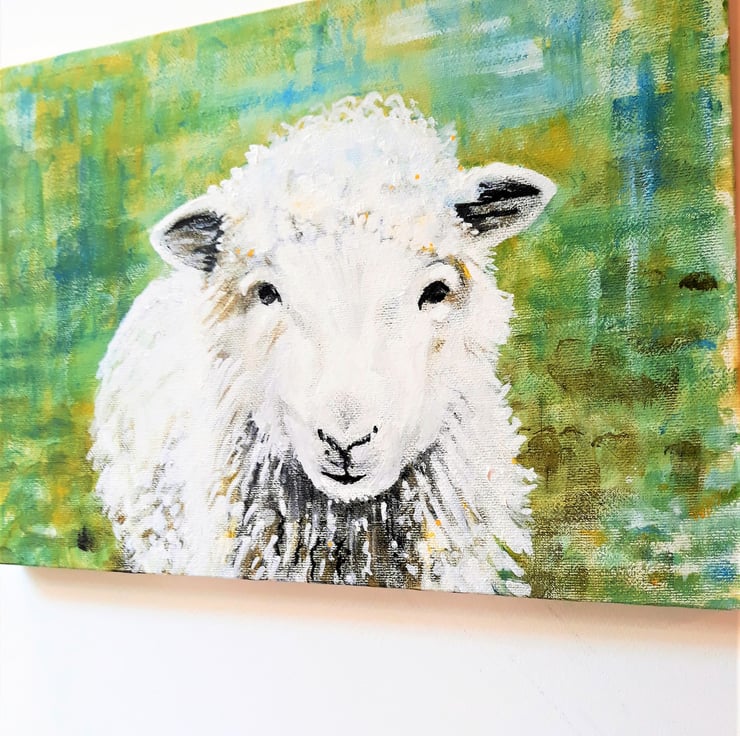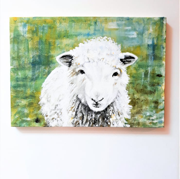 'The Friendly Sheep' is an original painting in acrylics on stretched canvas. The sheep is centre foreground and covers most of the canvas,.the painting is unframed, rectangular and hangs horizontally. Approximately A4 size. With a lovely background in shades of green, it can be hung without a frame if desired as the sides are painted. A perfect gift for a lover of unique art, this is the original painting, not a print.