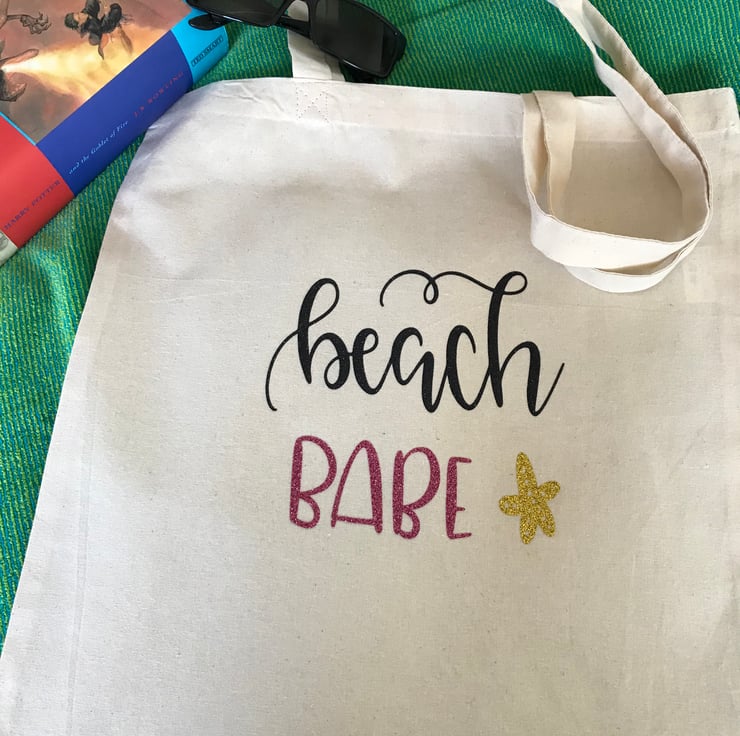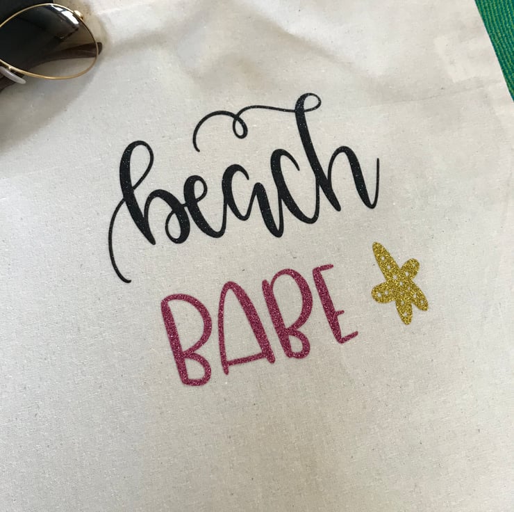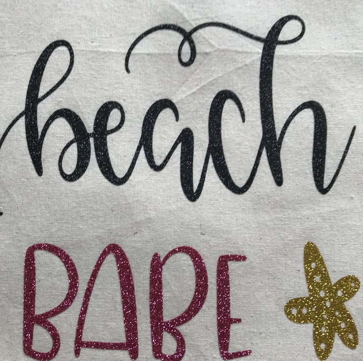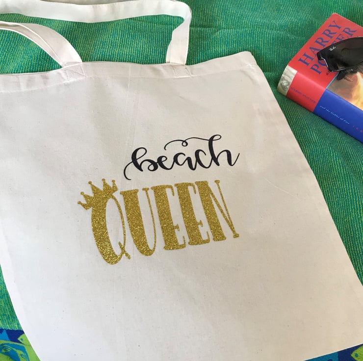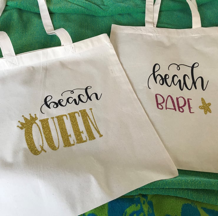 Tote bags with the words Beach Queen and Beach Babe in gold/black and pink/black glitter vinyl.