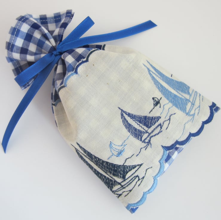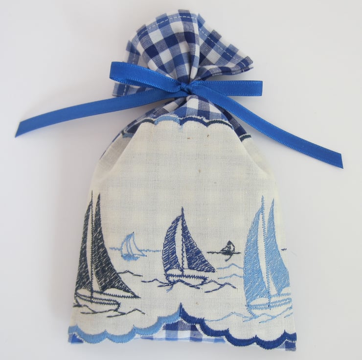 Lavender drawer sachet made from blue and white gingham and decorated with a vintage embroidered yachts design trim.