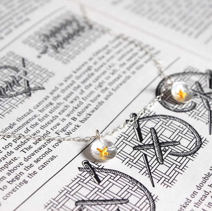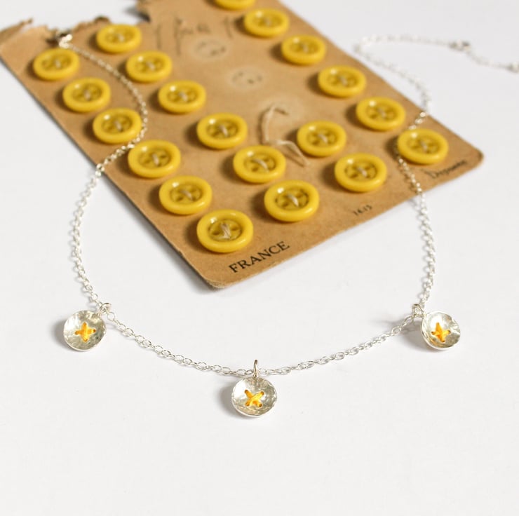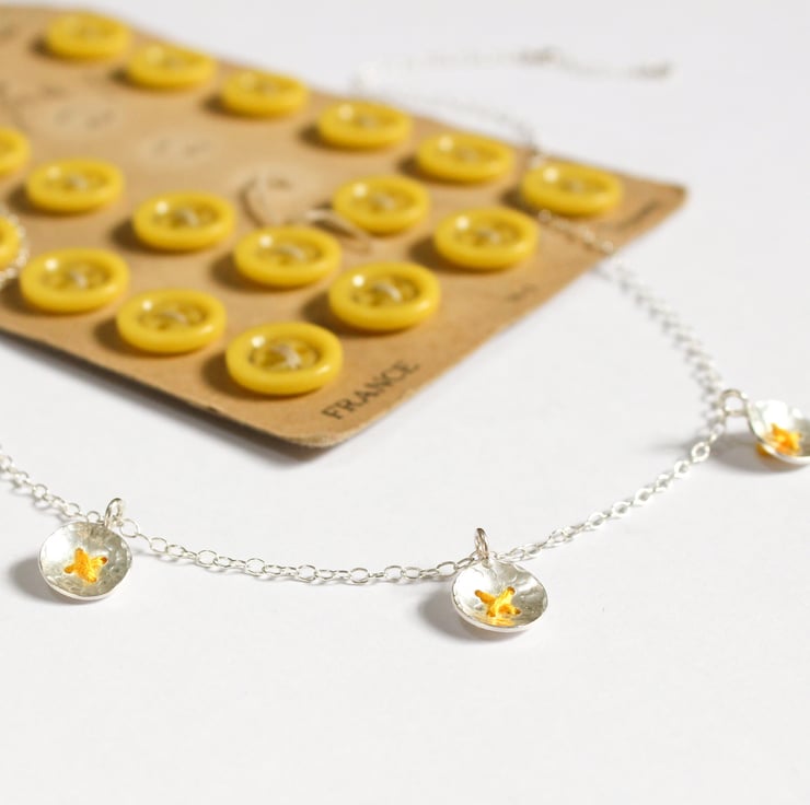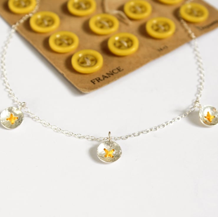 I make my best selling silver buttons in a slightly smaller size for this necklace (9mm diameter) solder jump rings to the edges of the buttons and then solder these to the chain loops with a nice space in between so that they hang around the neck nicely.