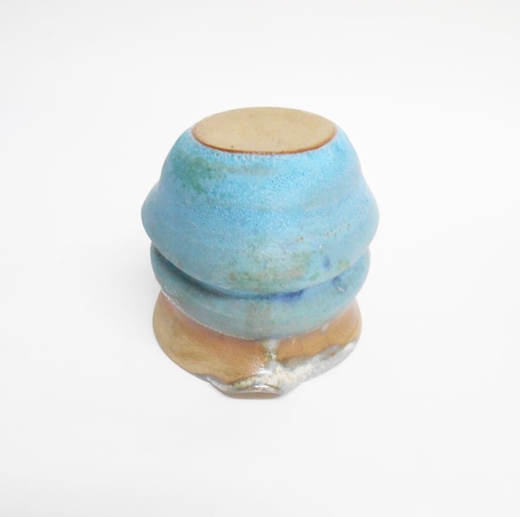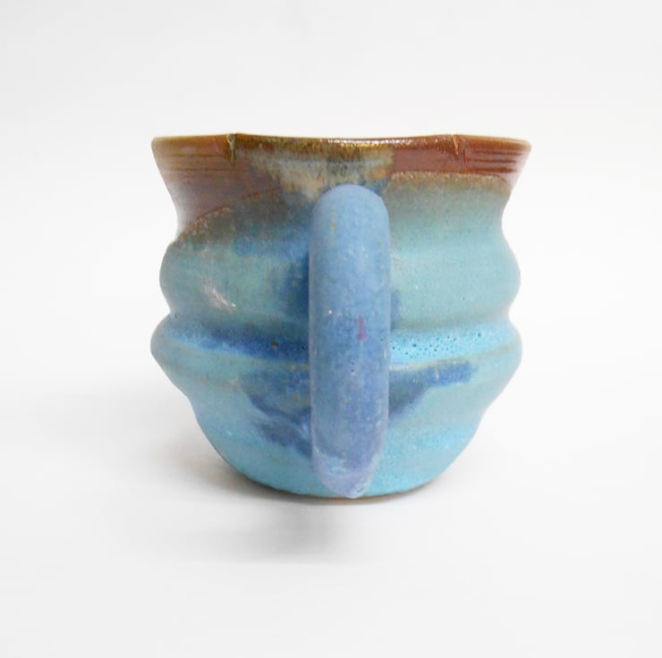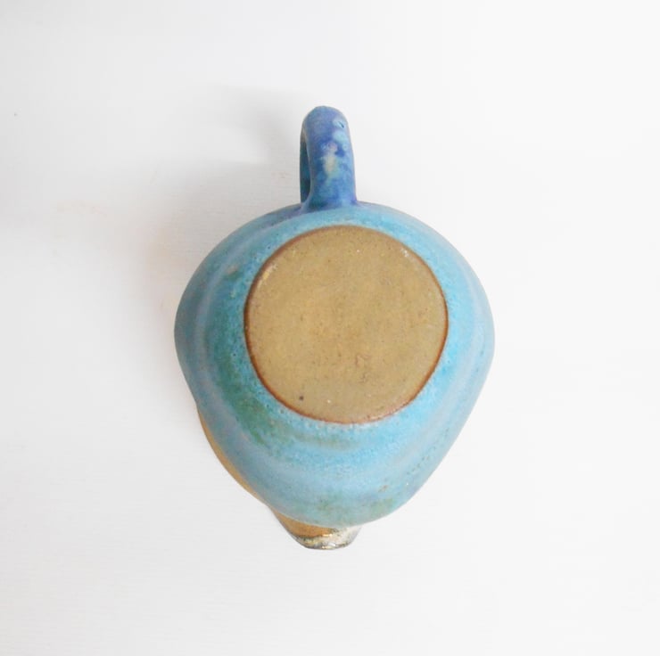 It has been glazed on the inside with a sstin finish Cloudy Blue glaze, and the outside has a textured Turquoise blue glaze.