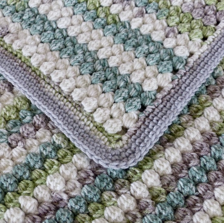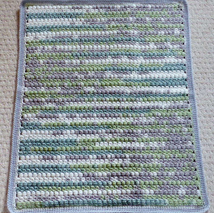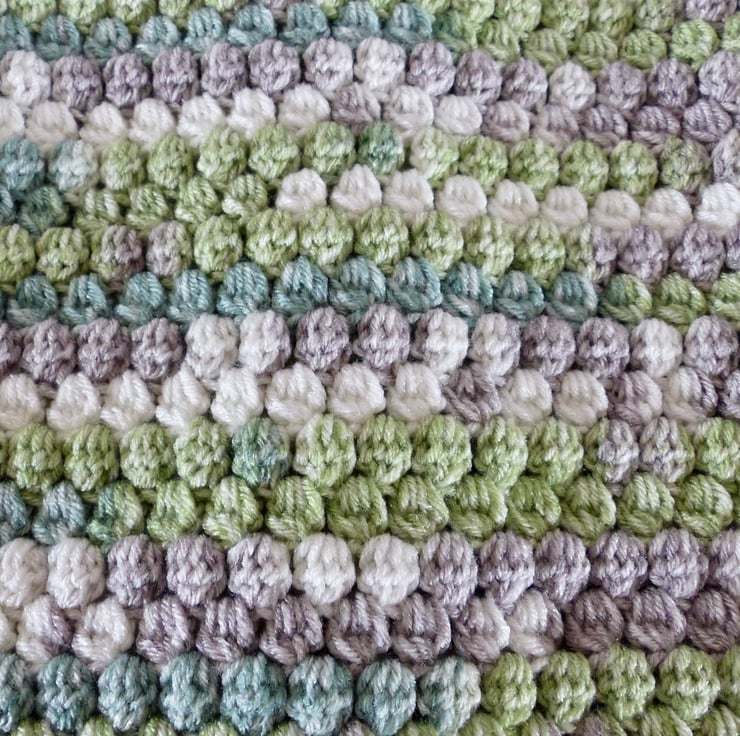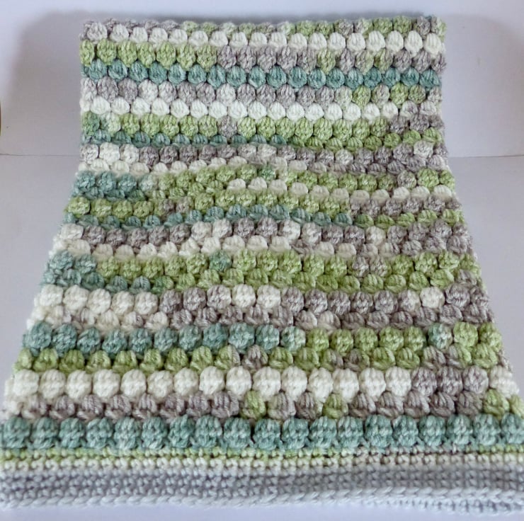 A crocheted baby blanket in a 100% acrylic variegated yarn of greens, greys and cream. I have used a four stitch bobble pattern for this blanket which measures approximately 68cm x 57cm (26" x 22"). Ideal for a pram, pushchair, moses basket or car seat and the colour would be suitable for a girl or boy. A lovely gift for a newborn baby or as a Baby Shower Gift.