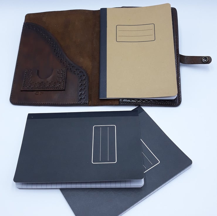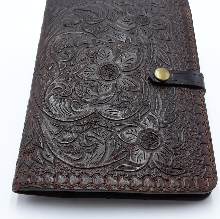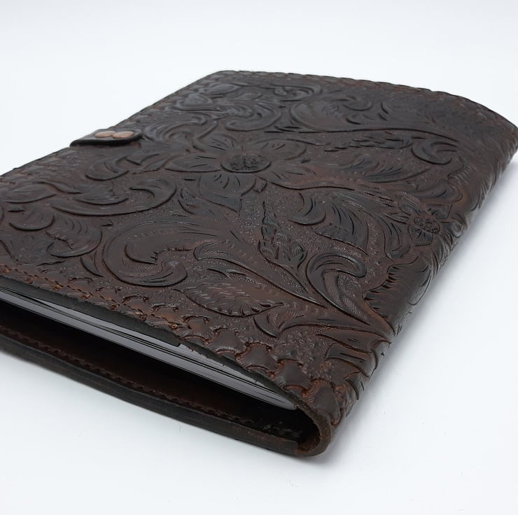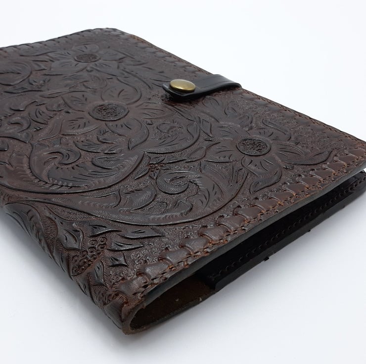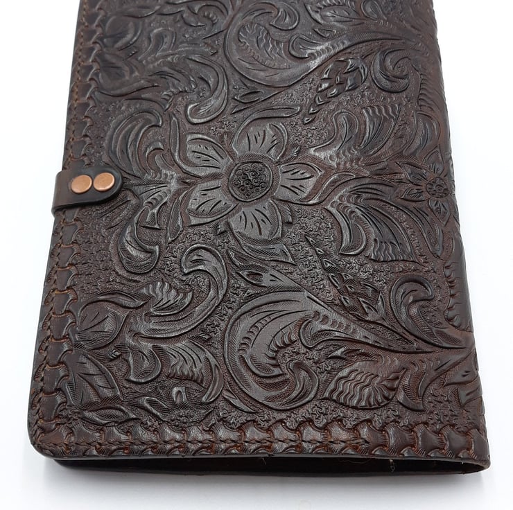 Hand carved and hand Tooled Note book or Journal cover, very tactile and hard wearing this book cover will last for years if looked after. Comes with a few notebooks.