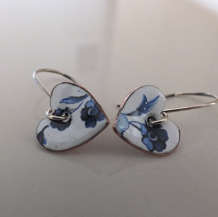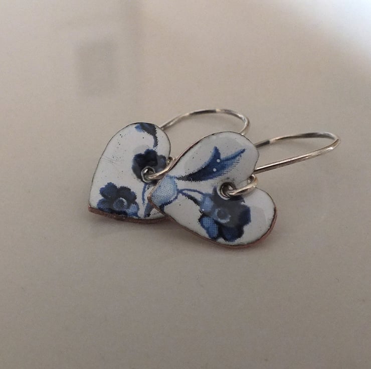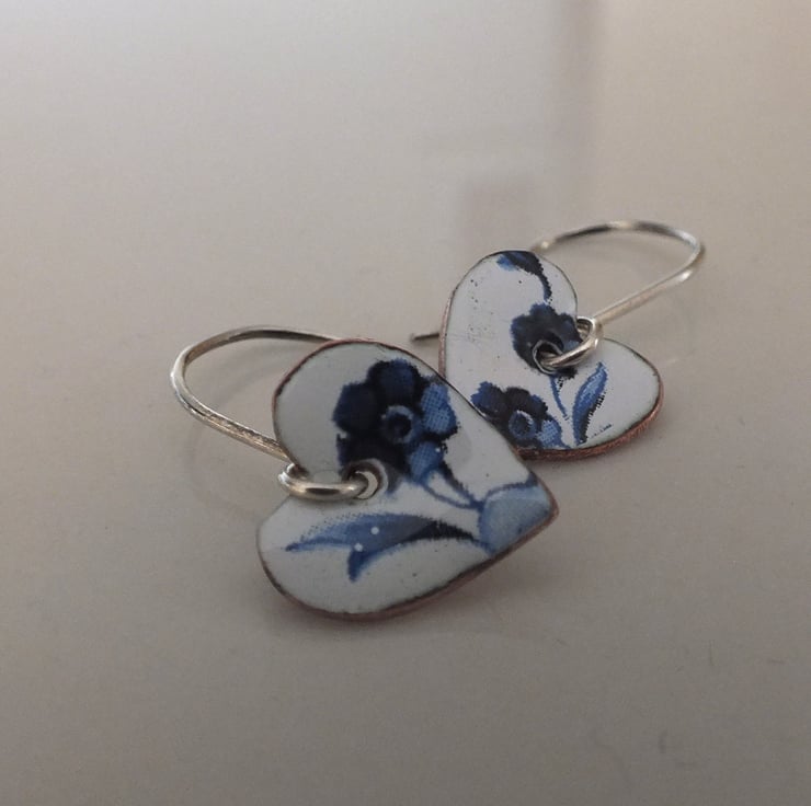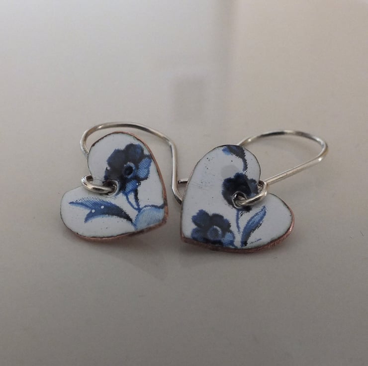 White enamelled heart shaped drop earrings, decorated with dark blue flowers, suspended from handmade sterling silver earring wires