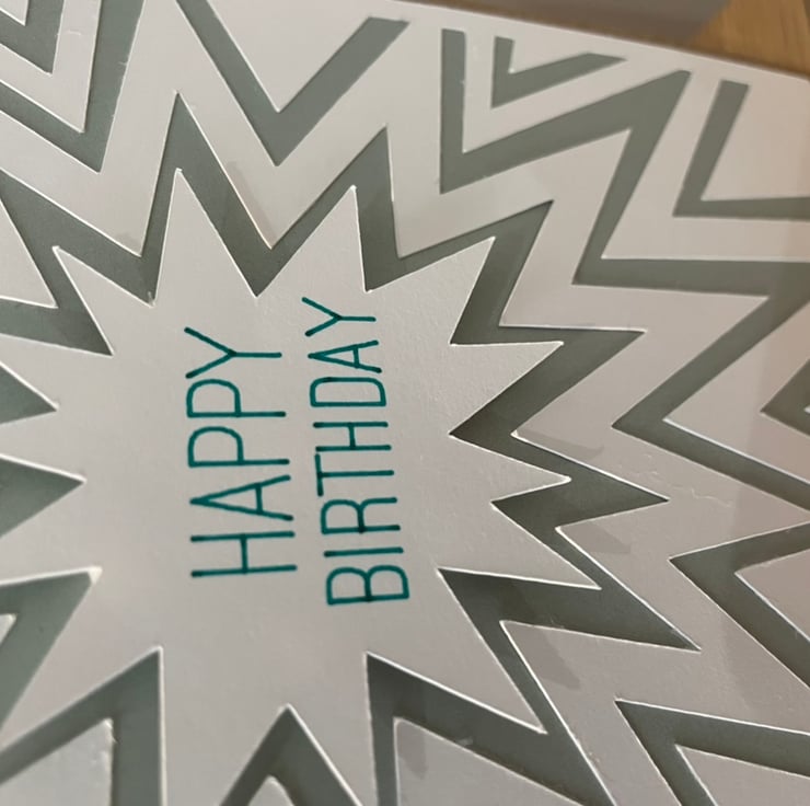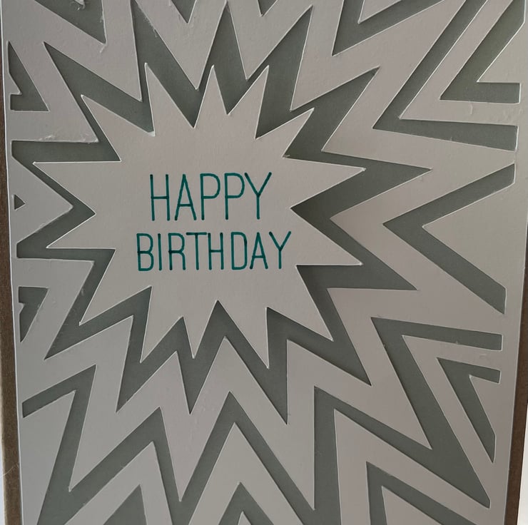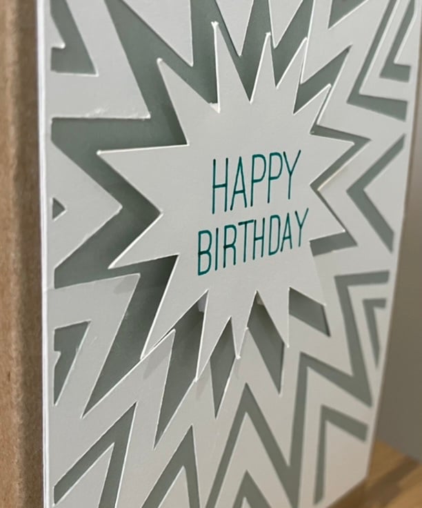 A6 sized brown Kraft card and envelope with laser cut star design on ultra smooth white card layered over a pale, pastel green coloured card. The central star has ‘Happy birthday’ written in turquoise ink and is raised above the rest to create a 3D effect. The card is blank inside for the sender to write their own message and card and envelope are sealed in a plastic wallet.
