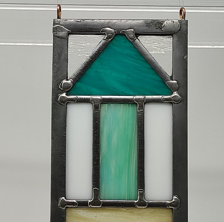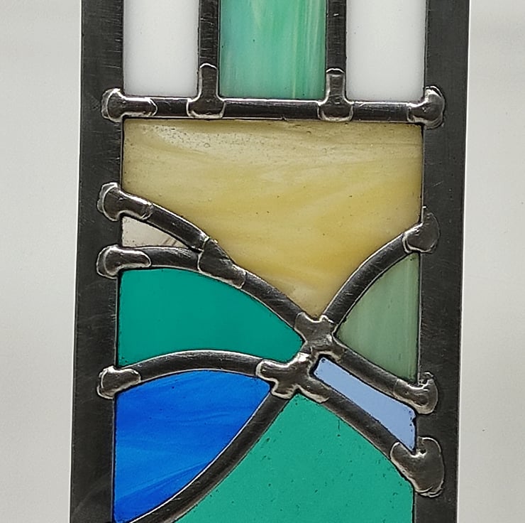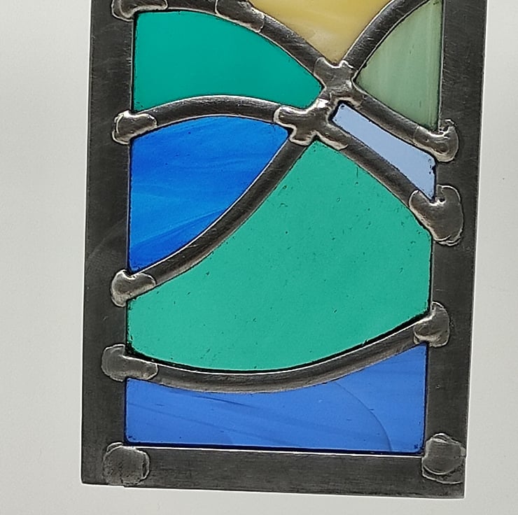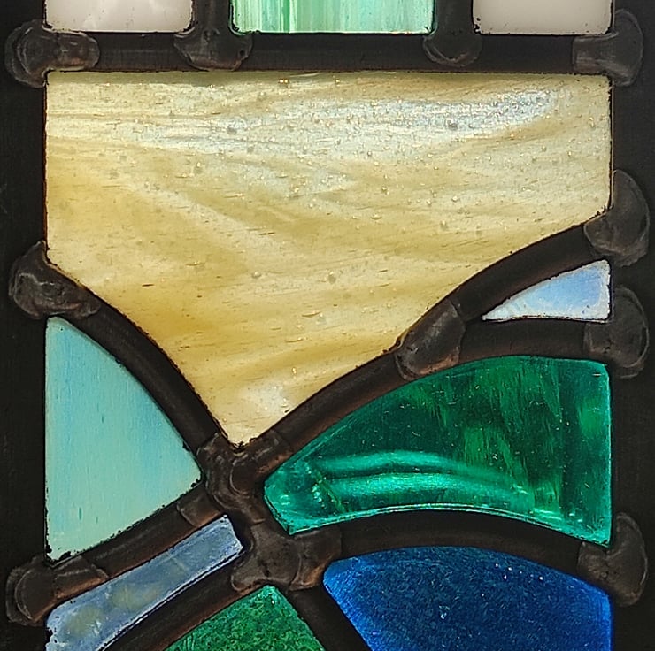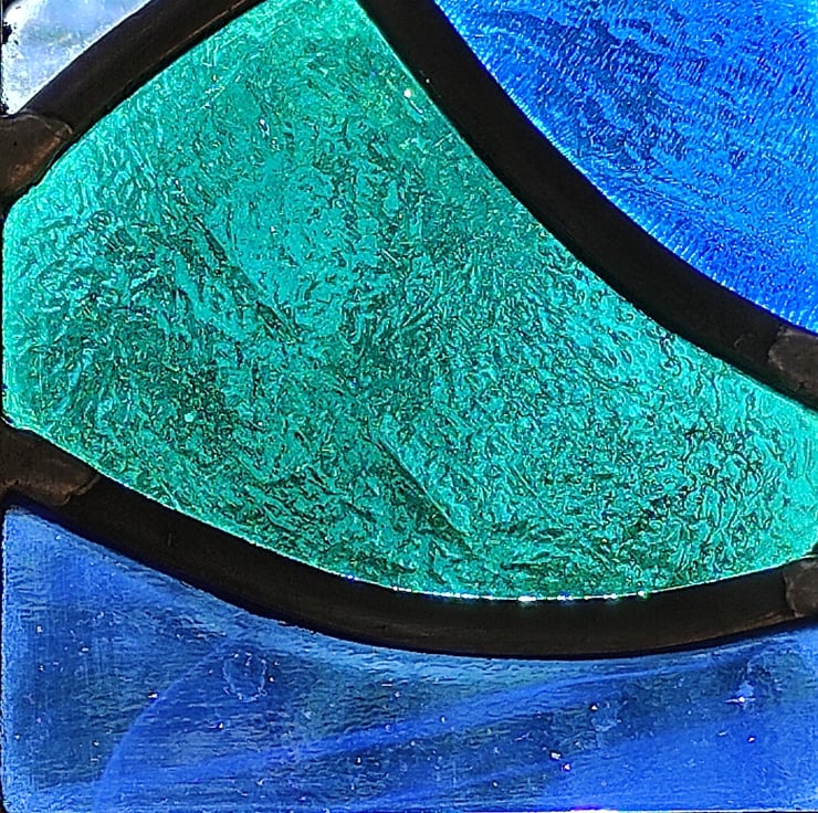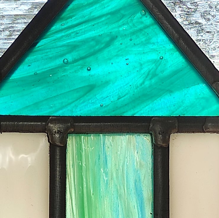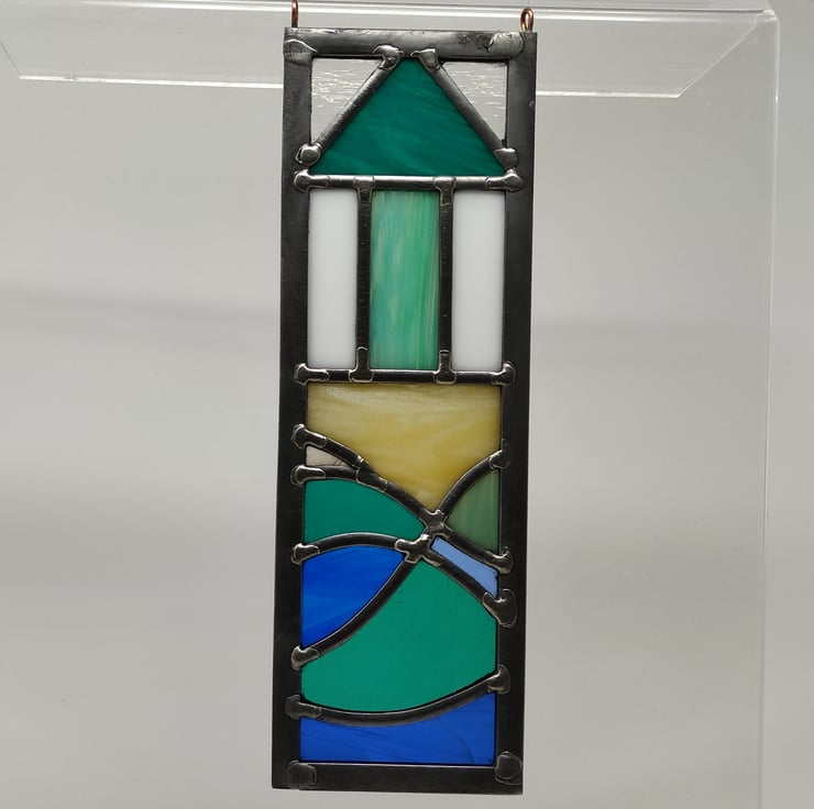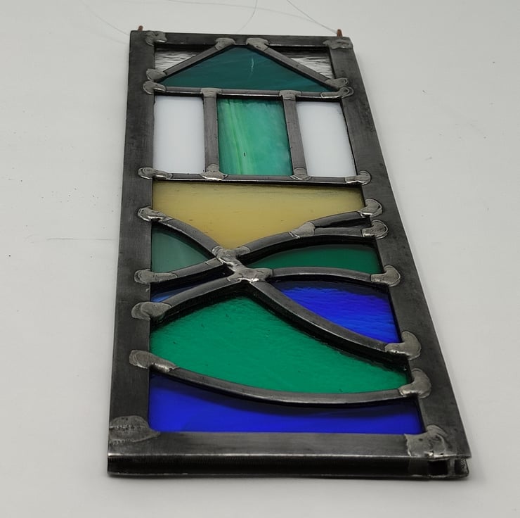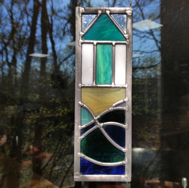 The colour palette for this panel is green, blue, turquoise and sand. I have mixed a variety of smooth and textured glass which compliment each other. These represent a snapshot of a single beach hut on a beach with the turquoise waves rolling in.