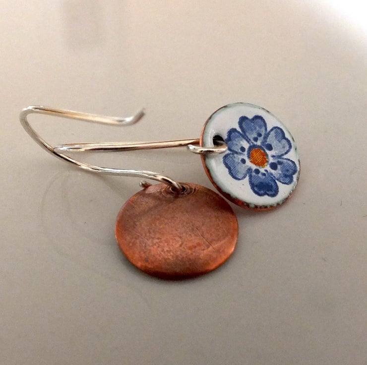 White enamelled disk earrings, decorated with blue flowers. Each disk is slightly concave, measures 13mm in diameter and has a natural copper finish on the back. The earring wires are handmade from sterling silver