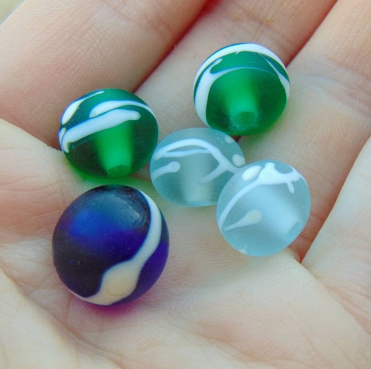 In my home studio, I wrapped molten glass in seaglass colours into a donut shape. Then I added a thin string of ivory glass stringer around each bead in a rustic fashion to depict the crashing waves in the ocean. To finish off the design I etched each bead for a seaglass-feel and aged-look.