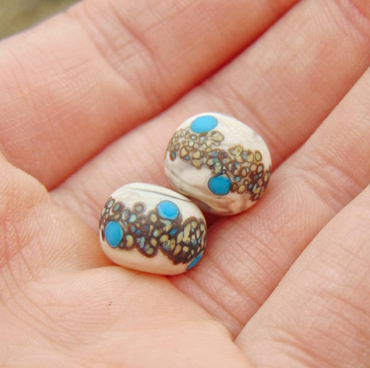 In my home studio, I wrapped molten glass in ivory white colour into a ring shape. Then I rolled each bead in raku frit and added dots of blue glass stringer for decoration. To finish off the design I dipped each bead in glass etching solution to give a sea-glass matte etched feel and look to the outside of each bead.