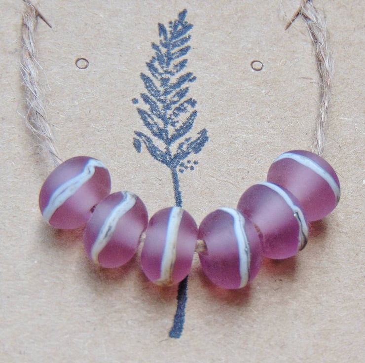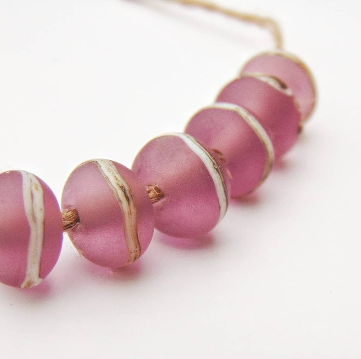 In my home studio, I wrapped molten glass in clear purple pastel colour into a ring shape. Then I added a thin stringer of white glass around each bead in a rustic fashion for decoration. To finish off the design I dipped each bead in glass etching solution to give a sea-glass feel and look to the outside of each bead.