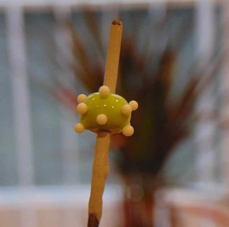 In my home studio, I wrapped molten glass in lime green colour into a ring shape. Then I added tiny white dots with a thin string of glass to each bead for decoration.
