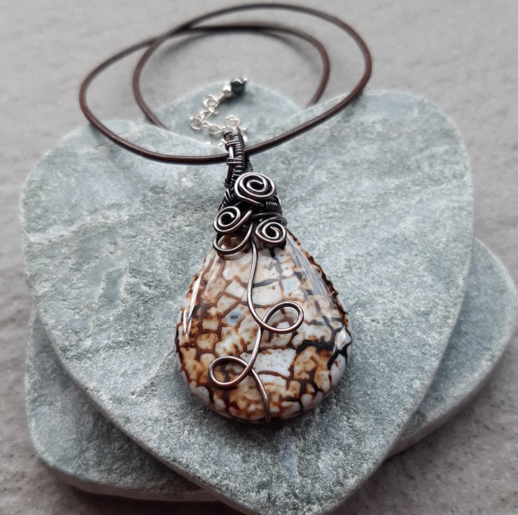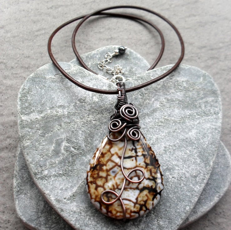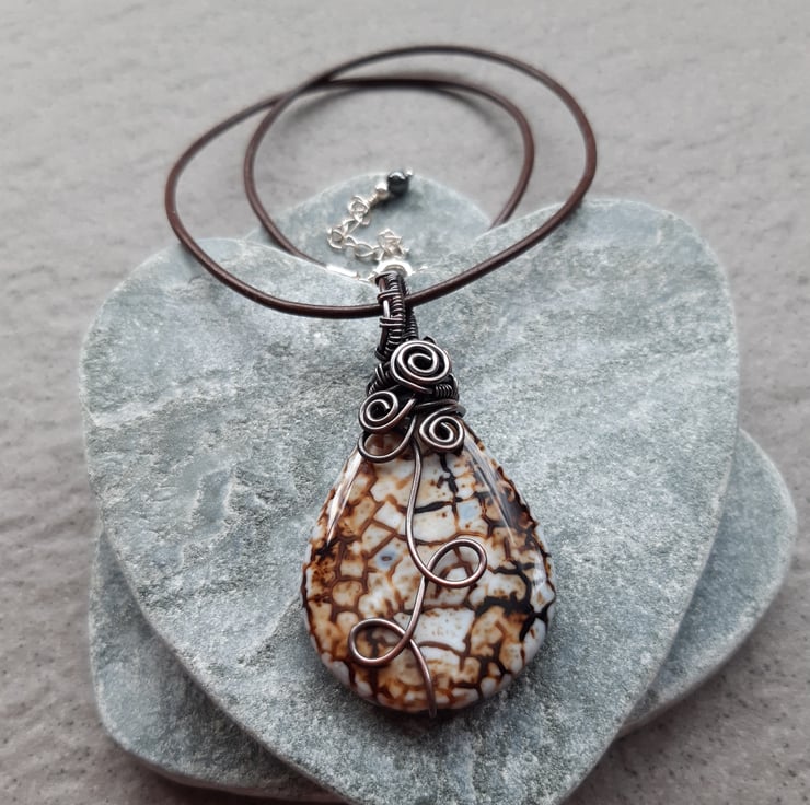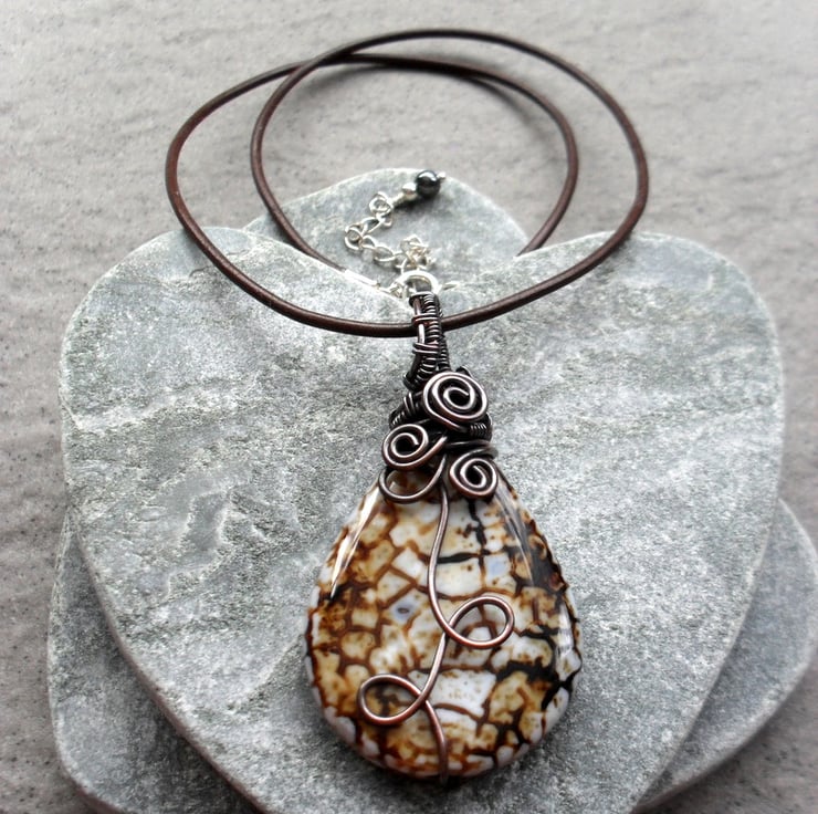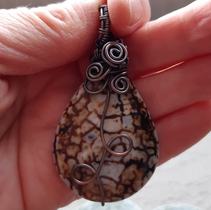 Copper wire wrapped agate pendant. The copper wire has been oxidised to give an aged look with the copper having lovely brown tones