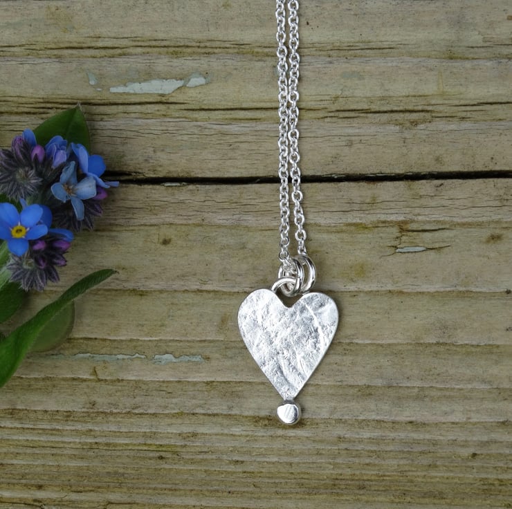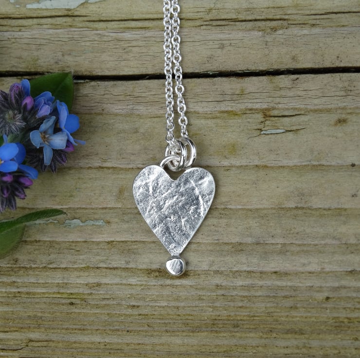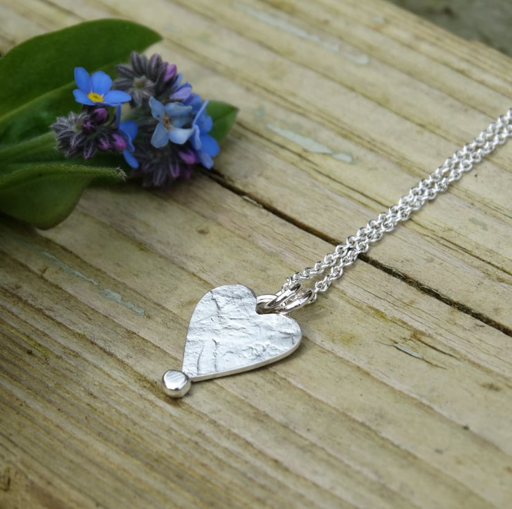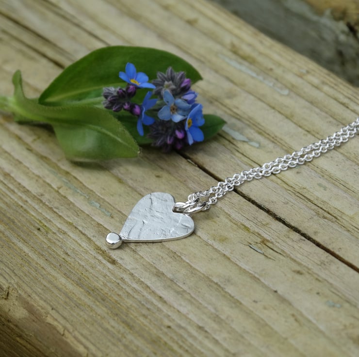 This little heart has been drawn by hand then cut out from Eco Silver sheet using a jeweller's saw, and textured all over. A little ball of recycled silver has been soldered on as a finishing touch.