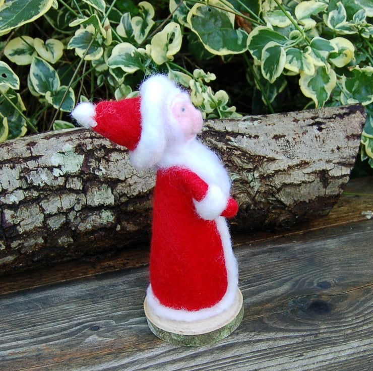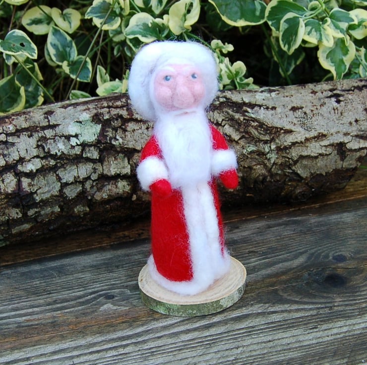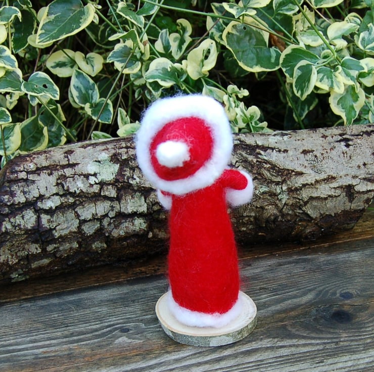 Strong core wool surrounds a wire frame. The core is topped with red Blue Faced Leicester wool. His beard, hair and face are wool. The fur trim around his coat edges and around his hat is synthetic toy stuffing. He his mounted on a wood slice.