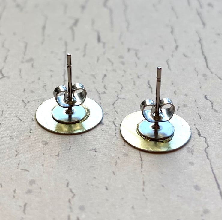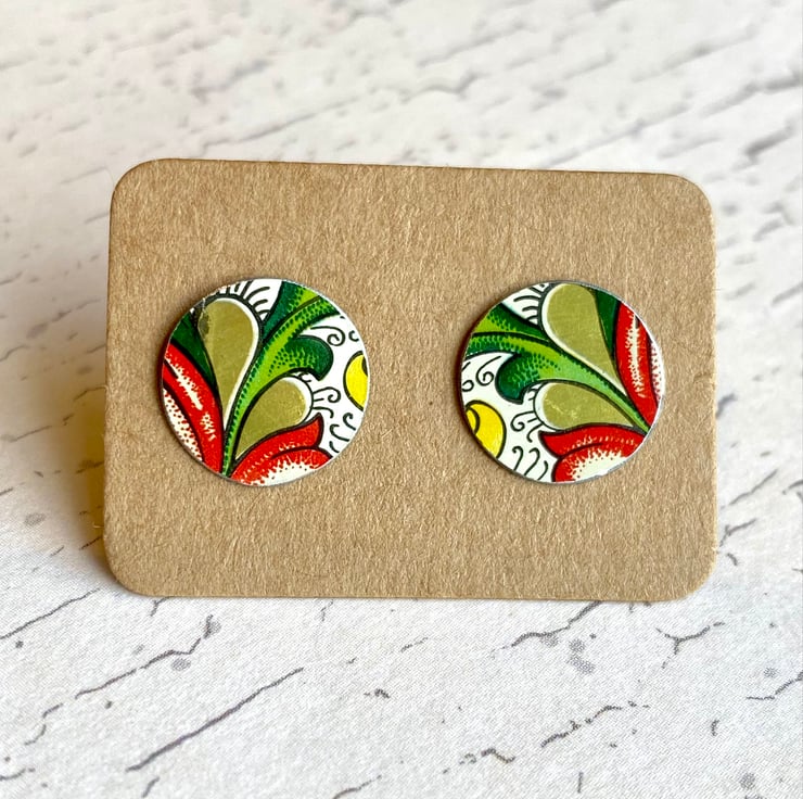 Hand cut from a decorative storage tin, these 12mm circle studs feature a floral design with green foliage and red petals on a cream background. They have steel ear posts with butterfly fastenings.