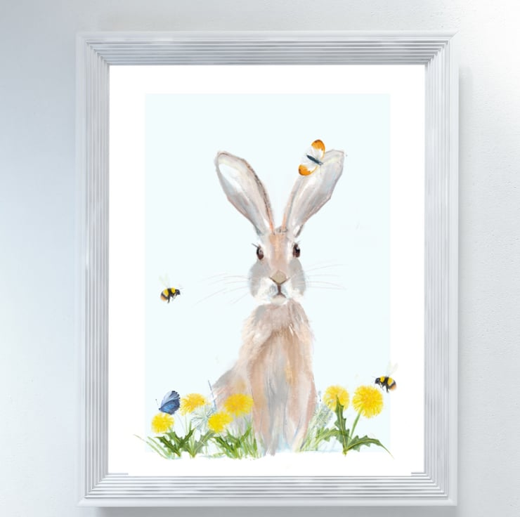 I painted the rabbit for Easter cards and have been wanting to use them for art prints. I then spotted a row of beautiful little dandelions, they were like little spots of sunshine on my mums driveway. I persuaded her to leave them there for the bees instead of pulling them up.
