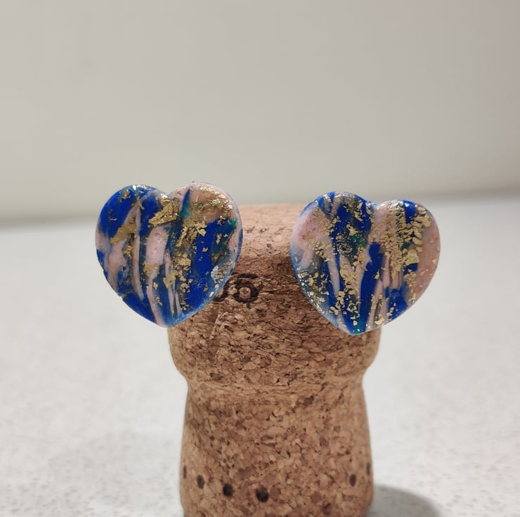 Hand made polymer clay earrings with an abstract pattern of blue and pink swirls and with gold flake Small- medium sized. Stud style fixing that can be painted with hypo allergenic coating for free on request.. Please see all photos for close up detail. All products handmade therefore there may be minor imperfections. Each pair sold as seen, message for more info
