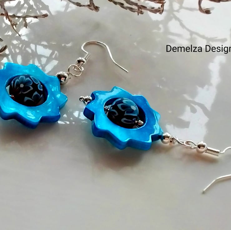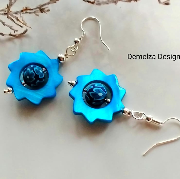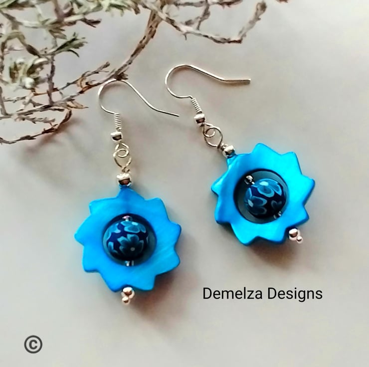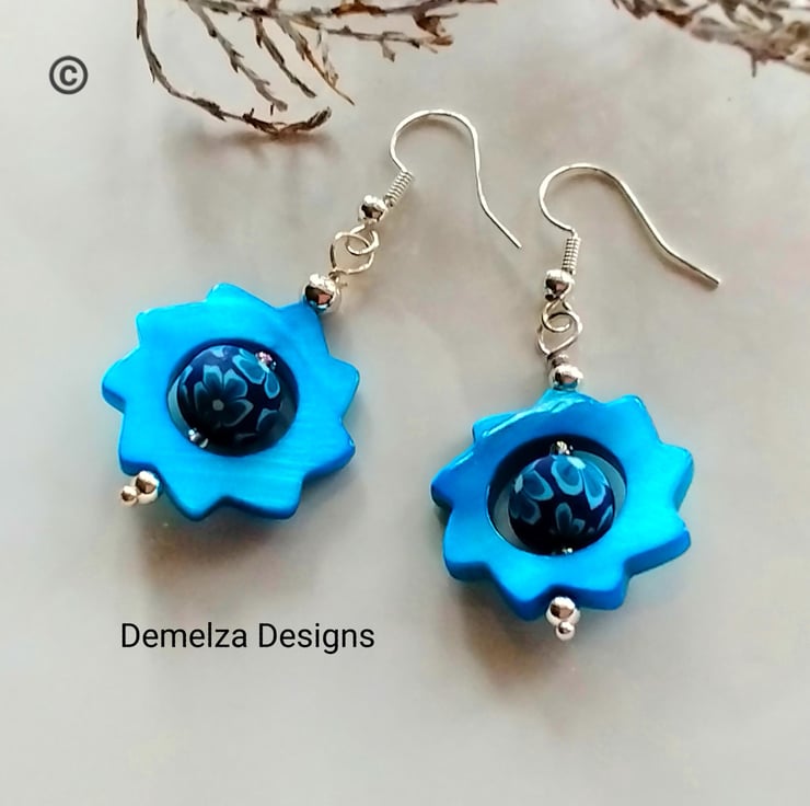 A very colourful eye catching pair of earrings designer and hand crafted using mother of pearl cartwheel cut design gemstone beads complimented with small hand made polymer clay beads. All other components used are quality silver plated.