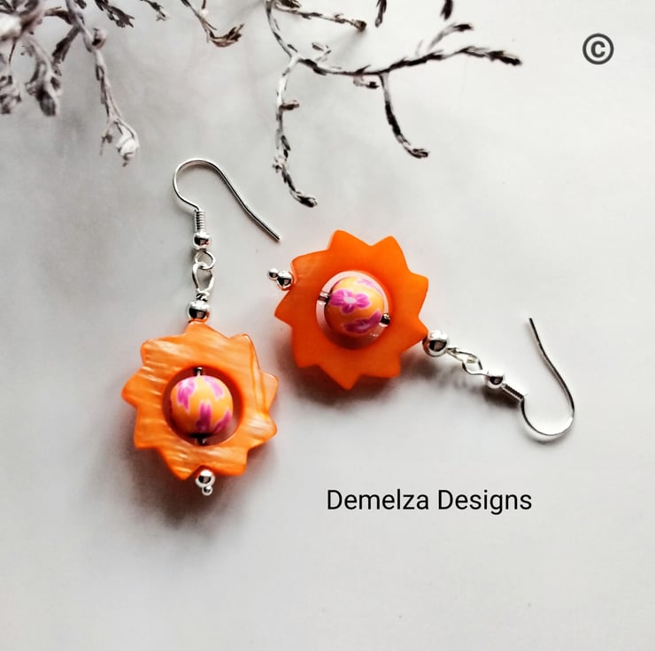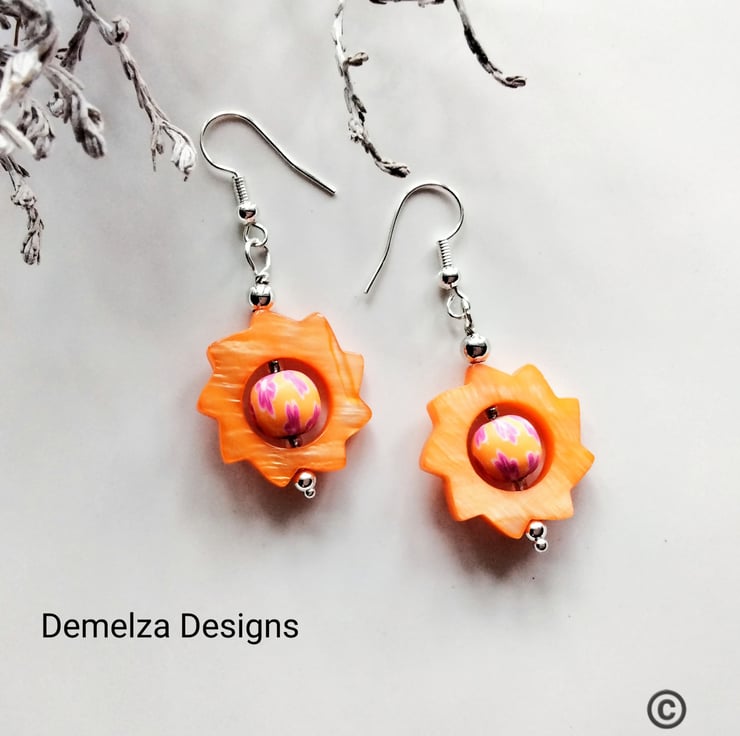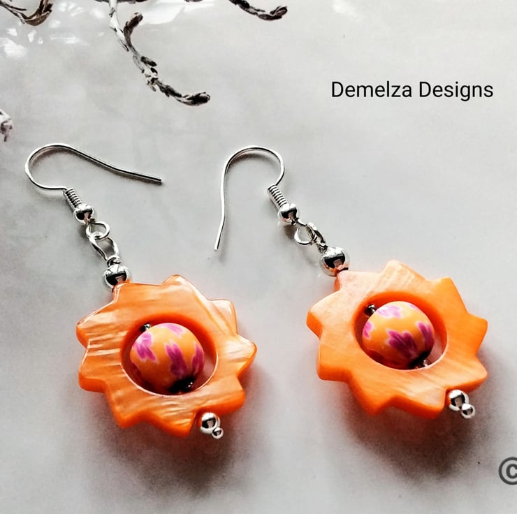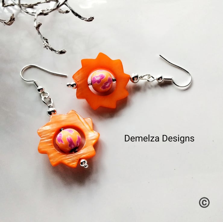 A very colourful eye catching pair of earrings designer and hand crafted using mother of pearl cartwheel cut design gemstone beads complimented with small hand made polymer clay beads. All other components used are quality silver plated.