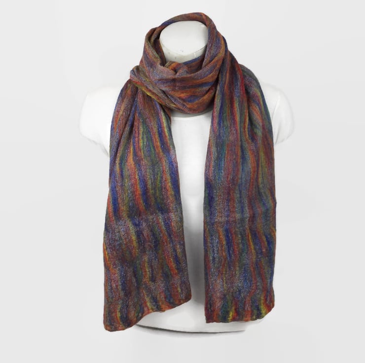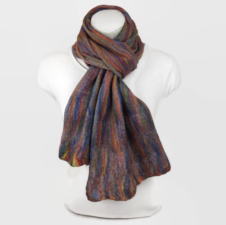 This gorgeous merino wool, nuno felted scarf has been made using a rainbow blend of merino wool fibres nuno felted to both sides of a blue cotton cheesecloth base material. Included in Seconds Sunday as a clearance/end of line item.