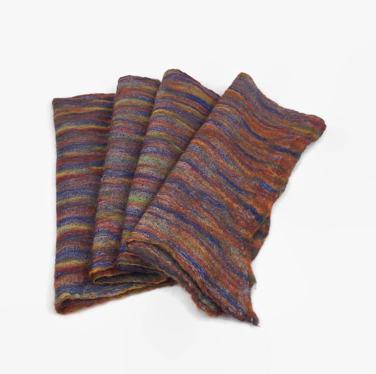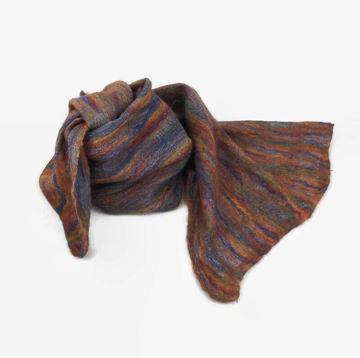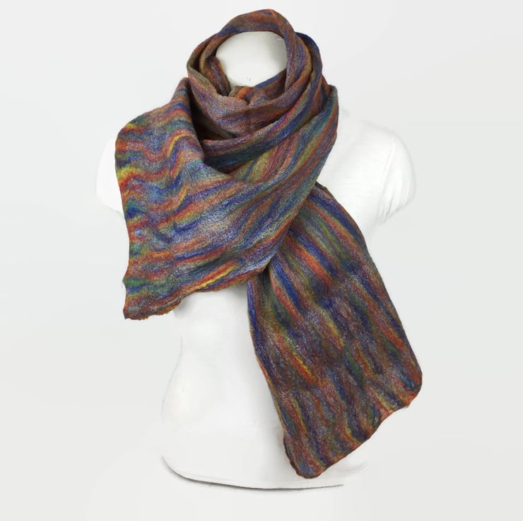 The resulting scarf is ideal to drape around the neck and shoulders or to wrap around the neck or tie in a knot as preferred. Perfect for a cool summer evening and equally as suitable on a cold winter day. The scarf measures approximately 172cm (68") x 33cm (13") and will arrive wrapped in pretty floral tissue paper making it an ideal gift. Perfect as a 7th wedding anniversary "woollen" gift or any other occasion. Full washing instructions and a short description of the nuno felting process are included.
