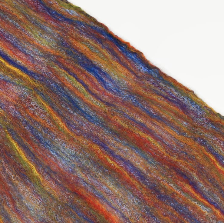 Variations of this scarf, made with the same rainbow blend of woollen fibres but various coloured cotton bases, are available in my shop
