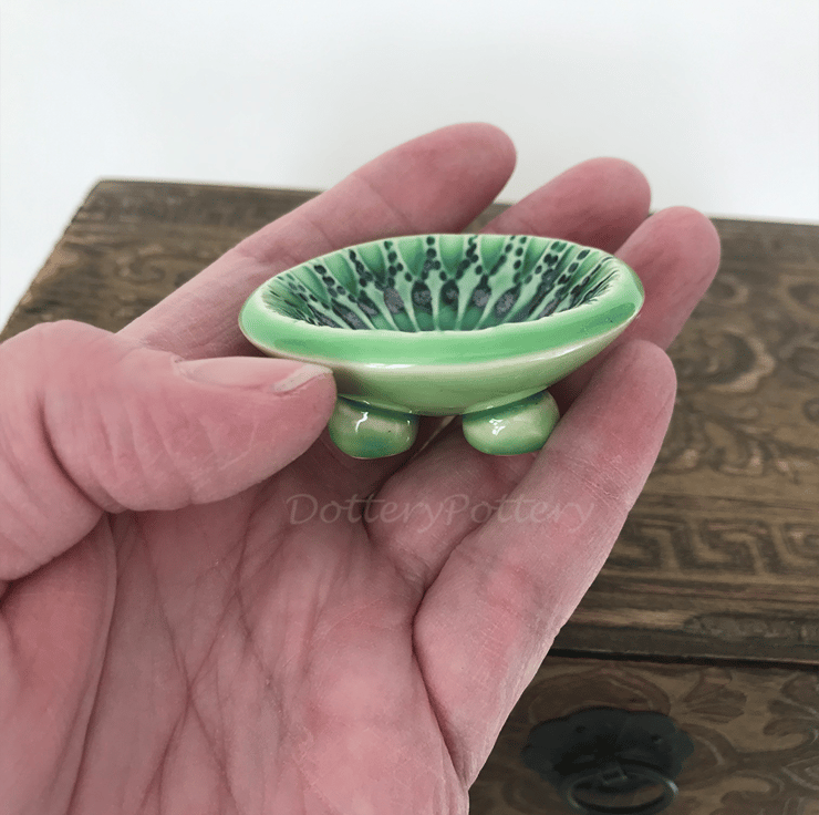 These little ceramic bowls are made from white earthenware clay and imprinted with pattern. Each pattern is handstamped and customised, so they are all slightly different. They have then been finished in bright, glossy glazes (food safe glaze) ready for you to use them how you like. Perfect as trinket dishes, incense cone bowls or even for teeny little dips! They have been fired in an electric kiln to 1100 degrees.They measure 5.5cm diameter x 2cm tall. They are quite tiny, so please check measurements if you are in doubt.