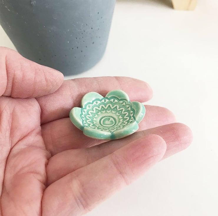This teeny weeny ceramic dish is made from white earthenware clay and imprinted with pattern. Each pattern is handstamped and customised, so they are all slightly different. It has then been finished in bright, glossy glaze (food safe glaze) ready for you to use them how you like. Perfect as trinket dishes or incense cone bowl or even for teeny little dips! They have been fired in an electric kiln to 1100 degrees.It measures 3.5cm diameter x 1.5cm tall. They are quite tiny, so please check measurements if you are in doubt. (on the bottom of each dish are the marks where they stand on a stilt during the firing process, so they don't stick to the kiln shelves)