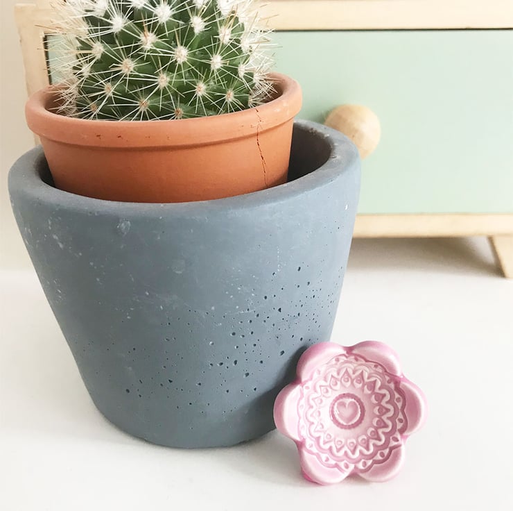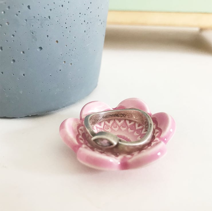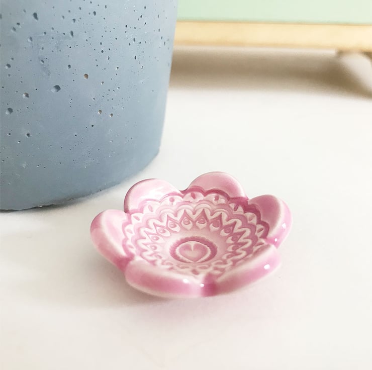 This teeny weeny ceramic dish is made from white earthenware clay and imprinted with pattern. Each pattern is handstamped and customised, so they are all slightly different. It has then been finished in bright, glossy glaze (food safe glaze) ready for you to use them how you like. Perfect as trinket dishes or incense cone bowl or even for teeny little dips! They have been fired in an electric kiln to 1100 degrees.It measures 3.5cm diameter x 1.5cm tall. They are quite tiny, so please check measurements if you are in doubt. (on the bottom of each dish are the marks where they stand on a stilt during the firing process, so they don't stick to the kiln shelves)