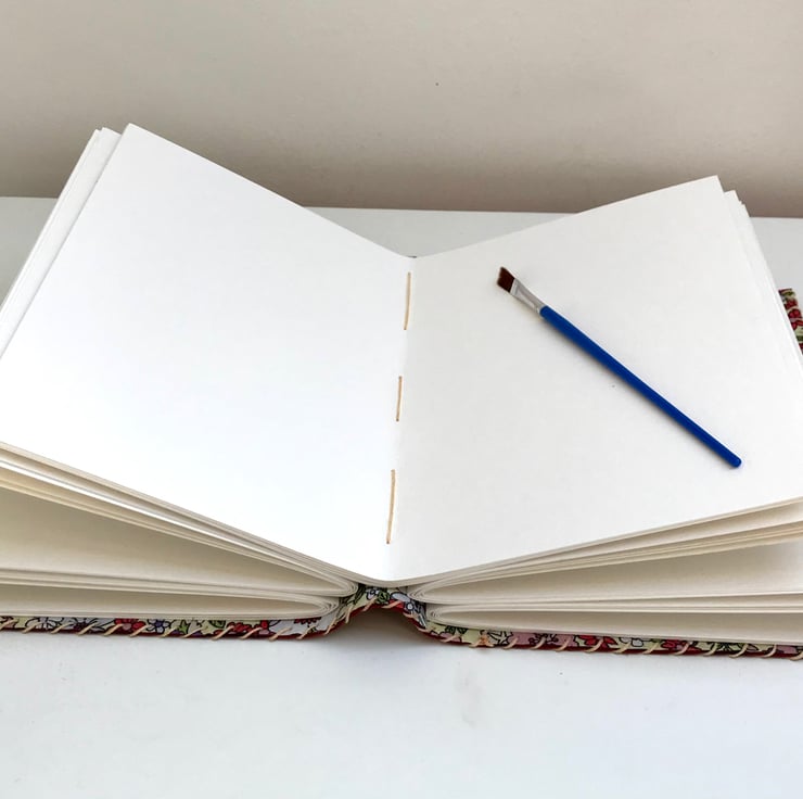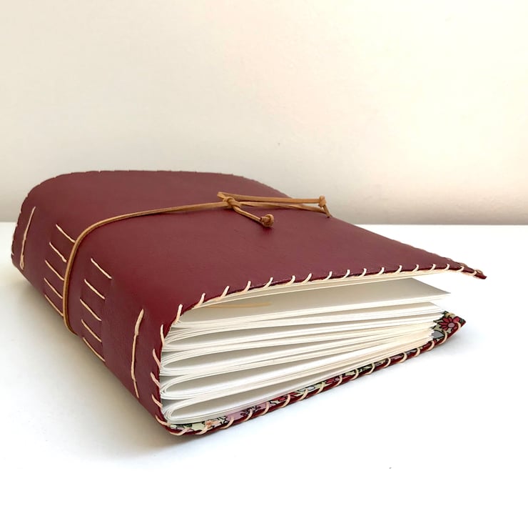 A beautiful light deep red soft leather with a pretty green, red, purple and cream floral fabric lining. The journal is hand stitched around the edge with a tan coloured thread and contains 100 blank sheets of thick 140g watercolour paper which are then hand stitched to the leather in 5 signatures. Tied loosely with a tan suede cord.
