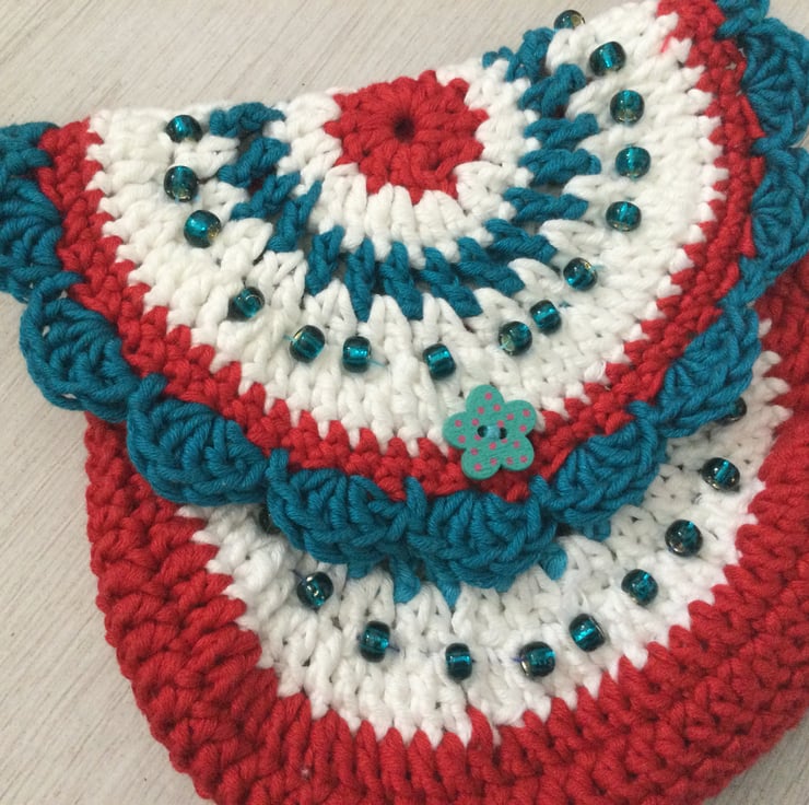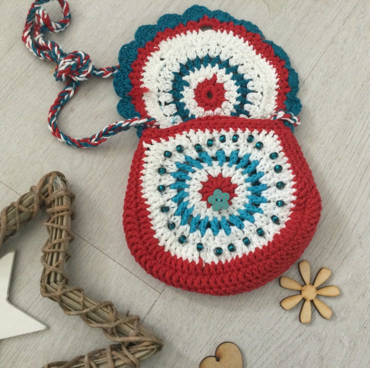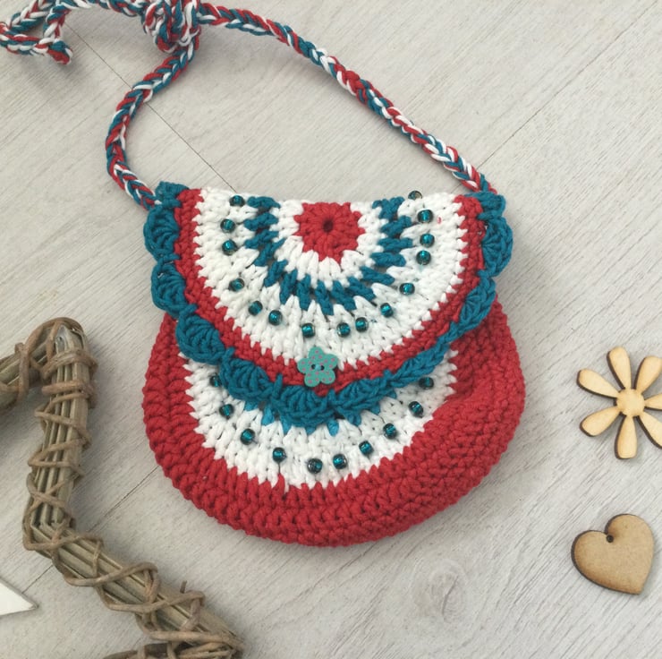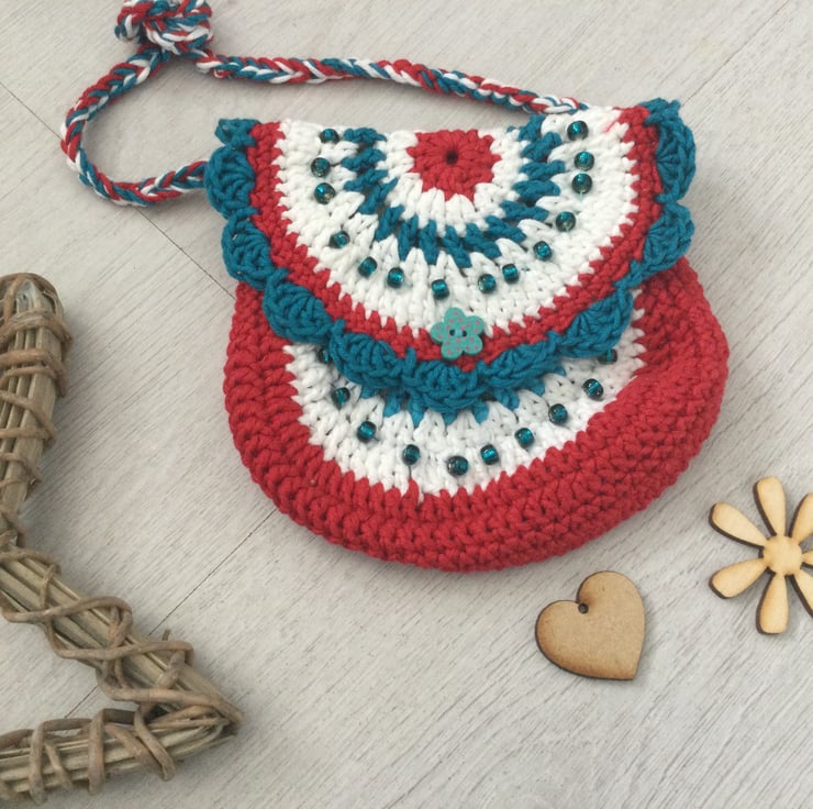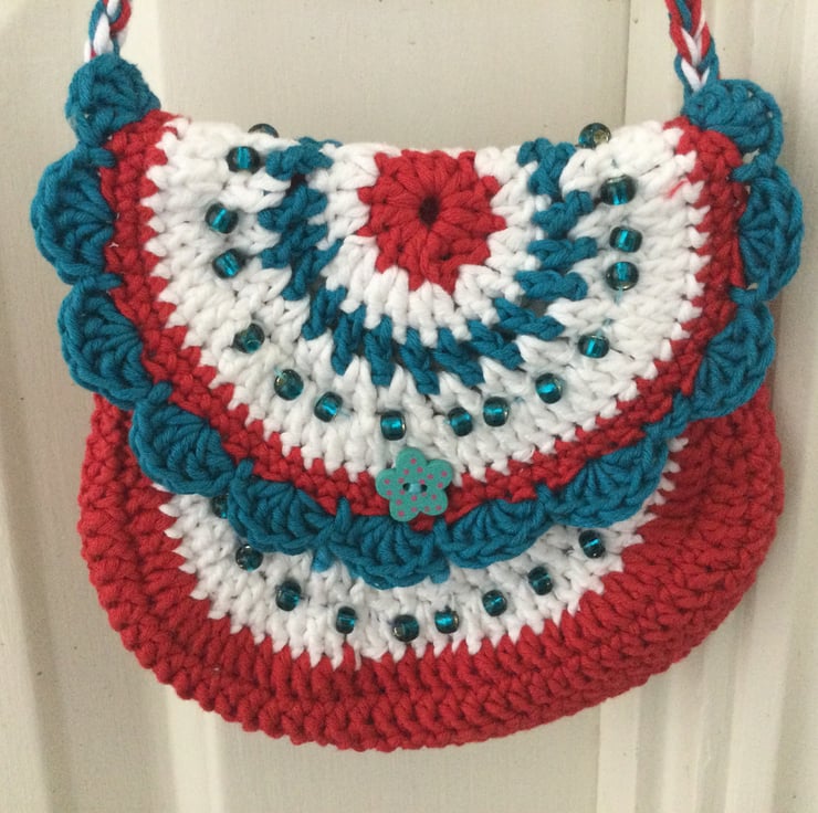 Sweet little across the body bag/purse hand crocheted in pretty colours of red, white and blue. A perfect gift for that special little girl to wear to a party or to go out shopping.