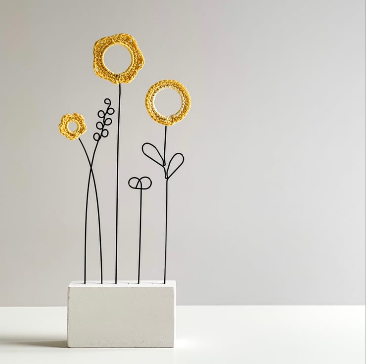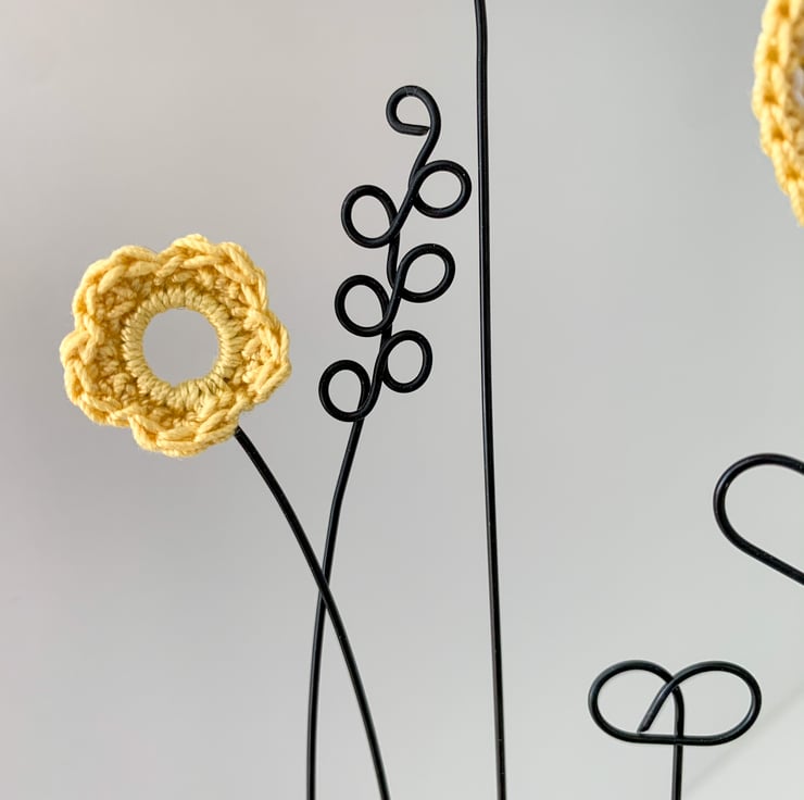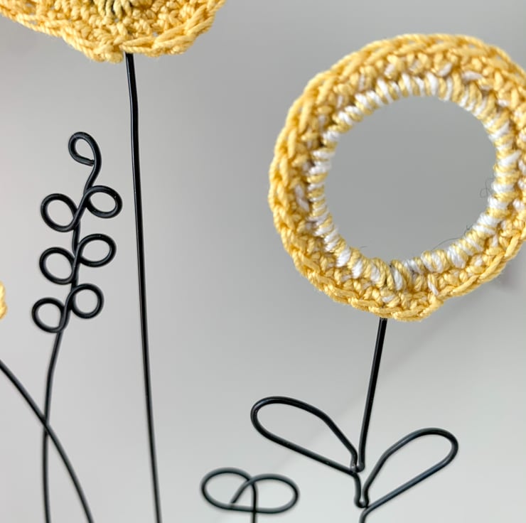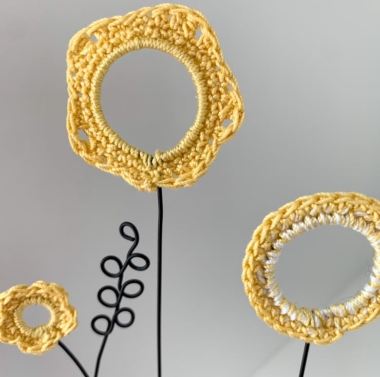 Wire flower stems with cotton crocheted flower heads add cheer to any space.