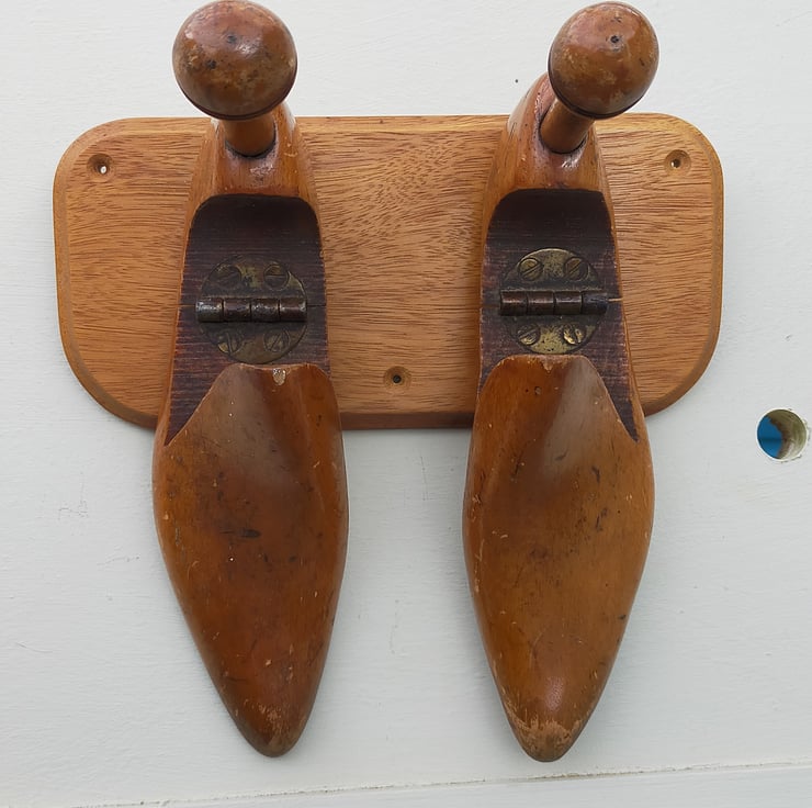 This is a lovely petite pair of vintage shoe stretchers, mounted on reclaimed mahogany so that towels and dressing gowns can be hooked onto the protruding handle or the pointed instep part of the toepiece. Waxed finish. L 260mm x H 120mm x D 150mm. Shoe length 240mm.