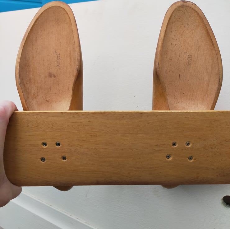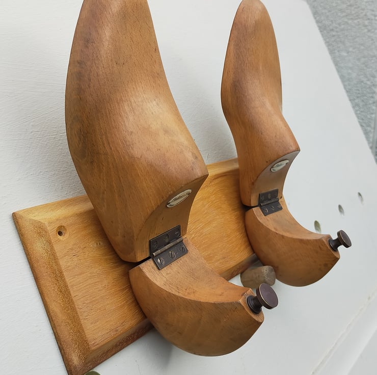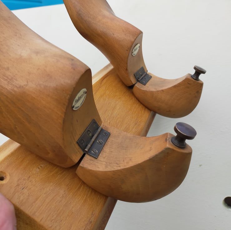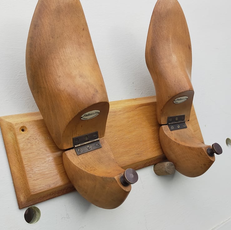 This substantial pair of gentleman's shoe stretchers were beautifully crafted in beechwood for Faulkner and Sons of London and Cambridge. I have mounted them on a reclaimed mahogany plaque so that anything with a loop can hang from the small brass handles whilst larger items can be draped over the toepieces. Waxed finish. L 350mm x H 115mm x D 110mm. Shoe length 290mm.