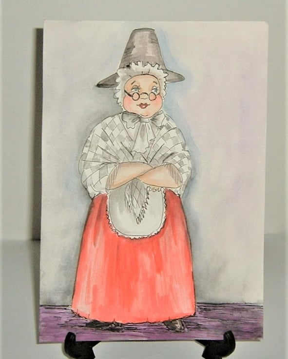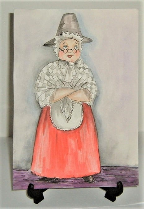 this is an original hand painted cartoon style painting of a lady in National Welsh Costume.