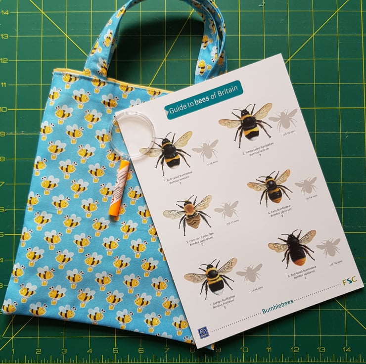 These little bags contain a bee identification chart (from the Field Studies Centre), a small magnifier ( I have made a pocket for this) and an FSC activity sheet.
