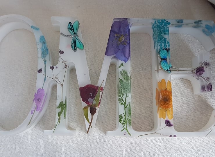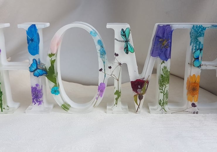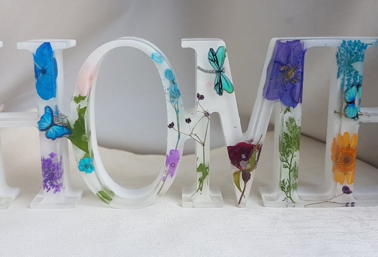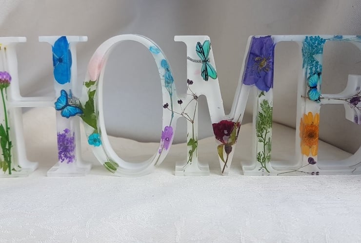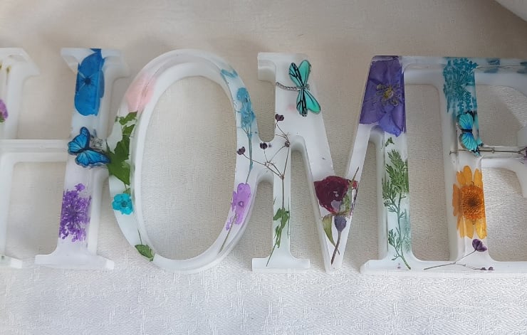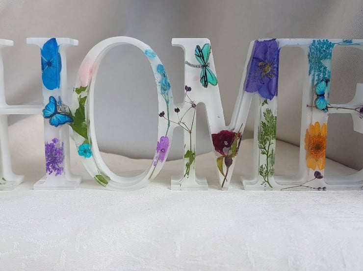 HOME sign is Clear Resin at the front with Real dried pressed flowers and enamel/metal charms and white resin to the back.