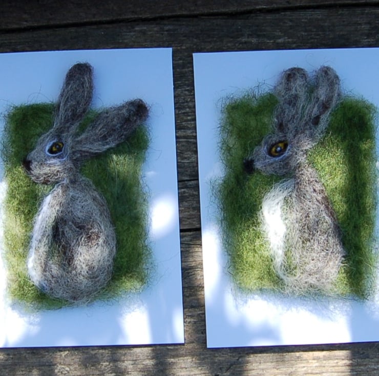 Two blank greetings card decorated with an hare made by needlefelting unspun fibre onto a piece of vintage wool blanket,