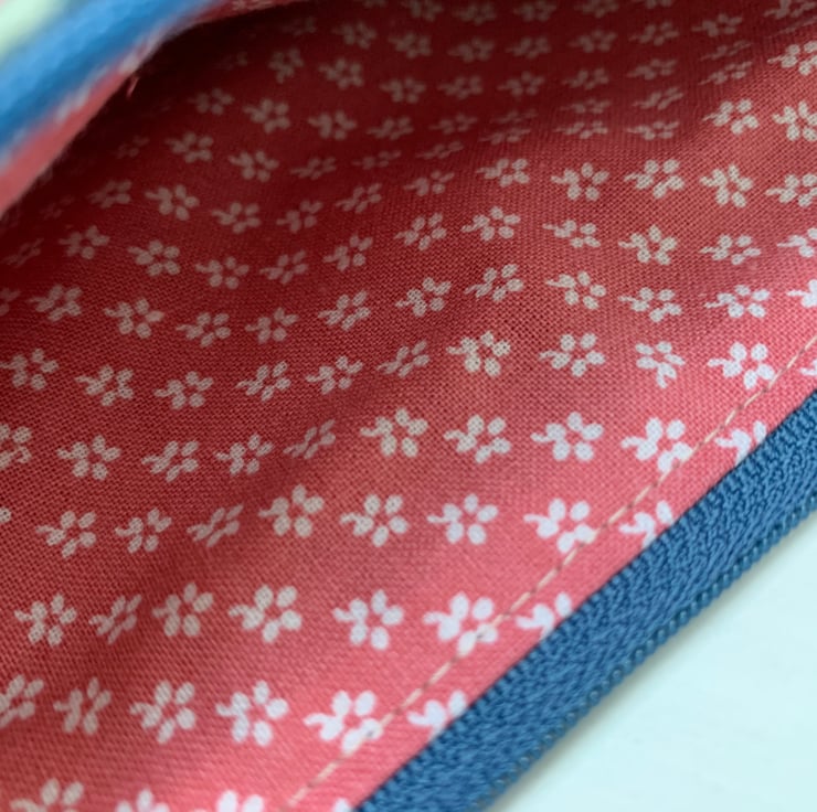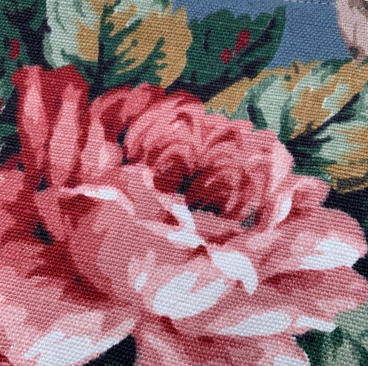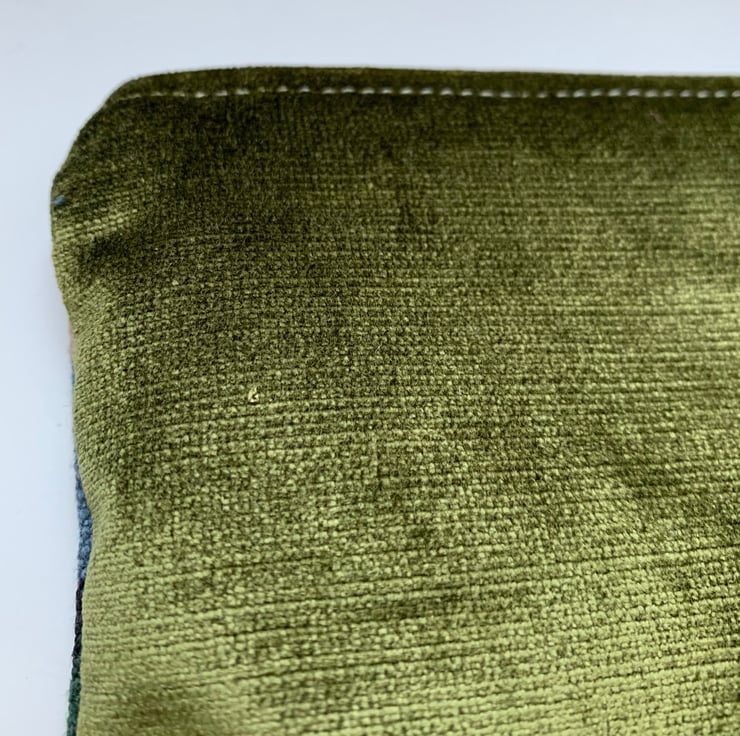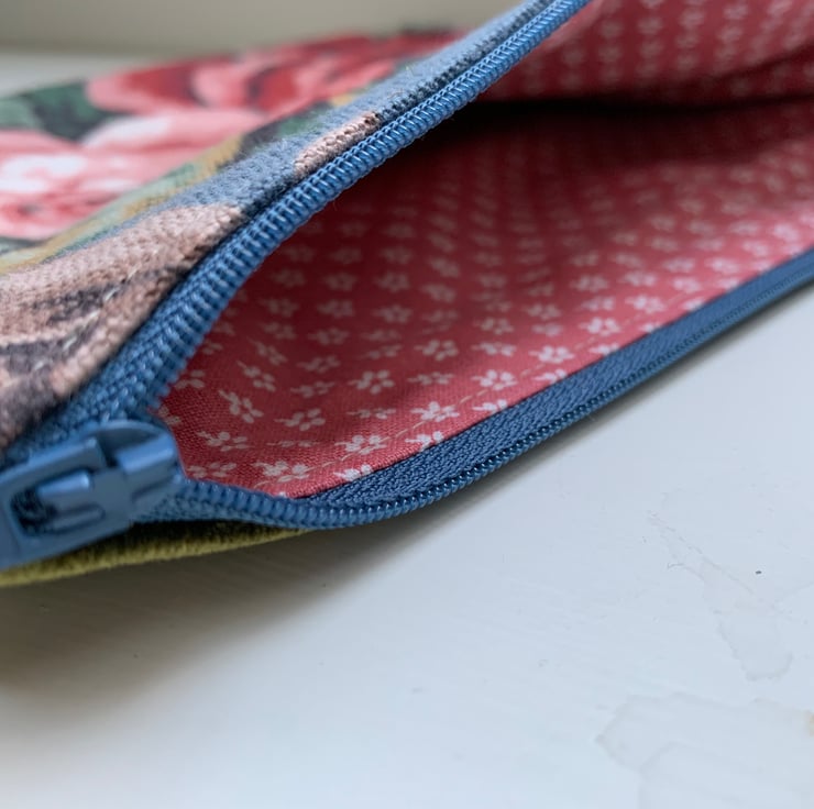 Pretty floral zip pouch in reclaimed vintage linen curtain fabric backed with deep green Designers Guild velvet. The bag is fully lined with cotton reclaimed from a vintage table cloth.
